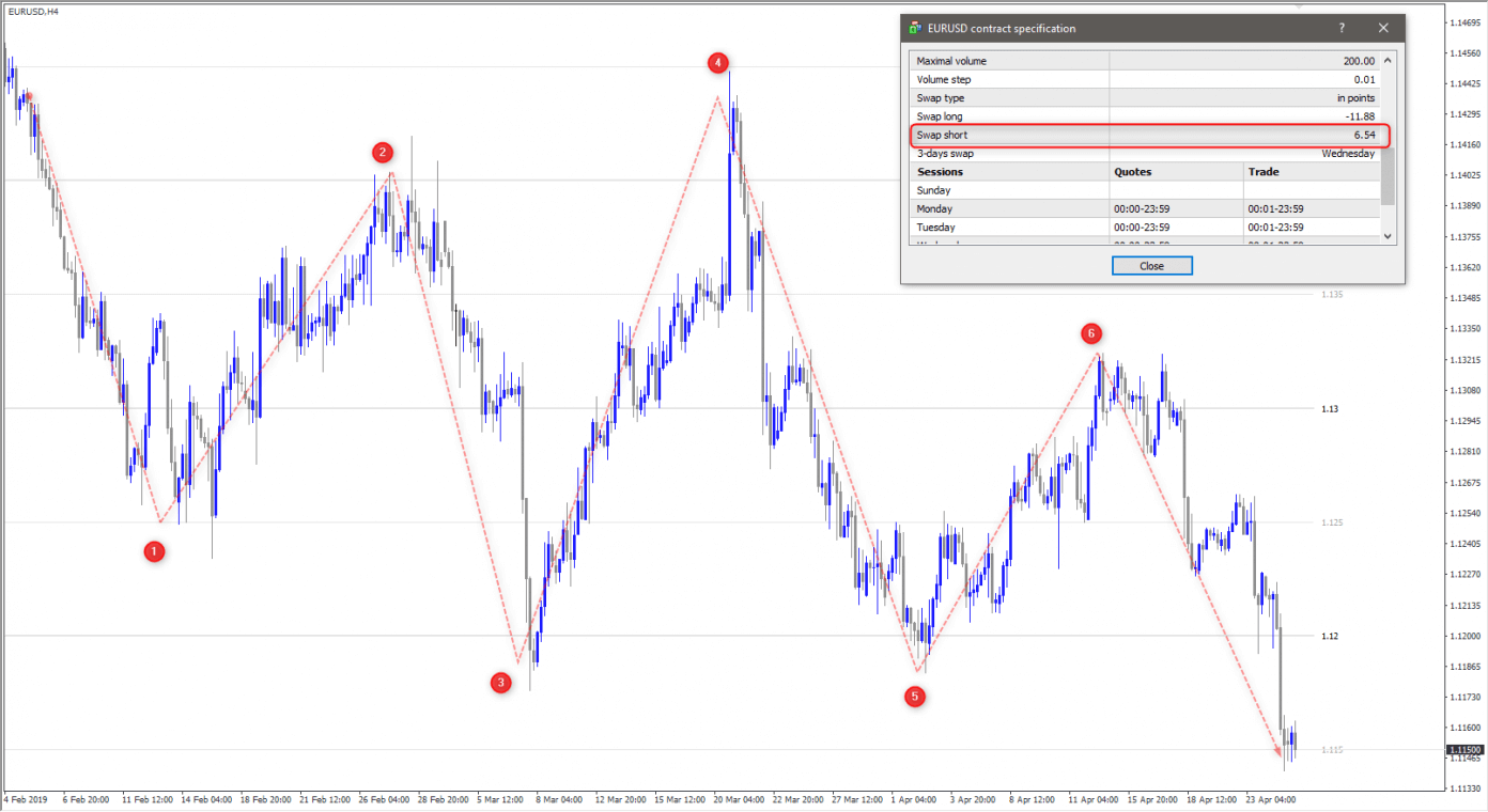 จากภาพที่ยกมาตั้งแต่เดือน 2 มาเมื่อมองชาร์ต H4 ท่านจะพบว่ามีการเปลี่ยนเทรนหรือที่เป็น Reverse แค่ 6 ครั้งเอง ถ้าเป็นเทรดเดอร์ที่เป็นพวก position traders ก็จะถือรอตามนี้ ถือออเดอร์เป็นหลายวันหรือหลายอาทิตย์ได้ ยิ่งถ้าทางที่พวกเทรดเดอร์พวกนี้ถือรอมีส่วนได้กำไรจากค่า swap ด้วยยิ่งดี เช่นเมื่อท่านเปิดรายละเอียดคู่เงินที่ท่านเปิดมาจะเห็นว่า swap short เป็นบวก เมื่อท่านถือ short positions ท่านก็จะได้กำไรจากส่วนนี้ด้วย ต้องไม่ลืมว่าขาใหญ่ที่ถือแบบ position traders พวกนี้เทรดด้วยทุนเยอะ ค่า swap นั้นก็มากพอที่จะเป็นรายได้เสริมของการเทรดได้