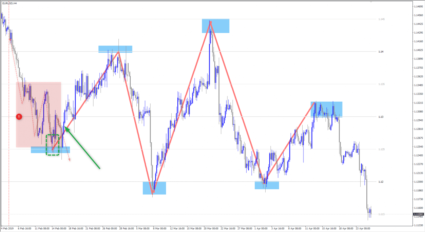 ที่กรอบพื้นที่เลข 1 เพราะความรู้เรื่องเทรนราคาทำ Lower lows ตามด้วย lower highs ทำให้เทรดเดอร์ส่วนใหญ่หันมาเปิด short positions เป็นหลัก ด้วยการเข้าเทรดแบบ retracement เป็น trend traders หรือ breakout traders ตอนที่ราคาเบรค low ด้วย ปัณหาเกิดขึ้นที่กรอบสีเขียวเพราะราคาลงไปหรือเบรค low ก่อนได้นิดเดียวแล้วรีบกลับมา ทำเป็นล่า stop hunt หรือ false breakout เมื่อเห็นแบบนี้การเทรดตามเทรนต้องระวังว่าตลาดกำลังบอกอะไรจะเกิดขึ้น จึงไม่ควรจะหาโอกาสเทรดตามเทรนหรือรอให้ชาร์ตเปิดเผยข้อมูลต่อก่อน จนกว่าเกิด impulsive move ที่ลูกศรชี้ราคาขึ้นไปทำ higher high ได้เอาชนะพื้นที่เป็น high ที่ใกล้ที่สุดขึ้นไปได้ ราคาย่อตัวมาก็เป็นเงื่อนไขเข้าเทรดตอน retracement และเทรนเริ่มเปลี่ยนราคาทำ higher low ที่จัด retracement แรกและขึ้นมาทำ higher high อีกจุดสูงขึ้น เริ่มเข้าการทำเทรนขาขึ้น