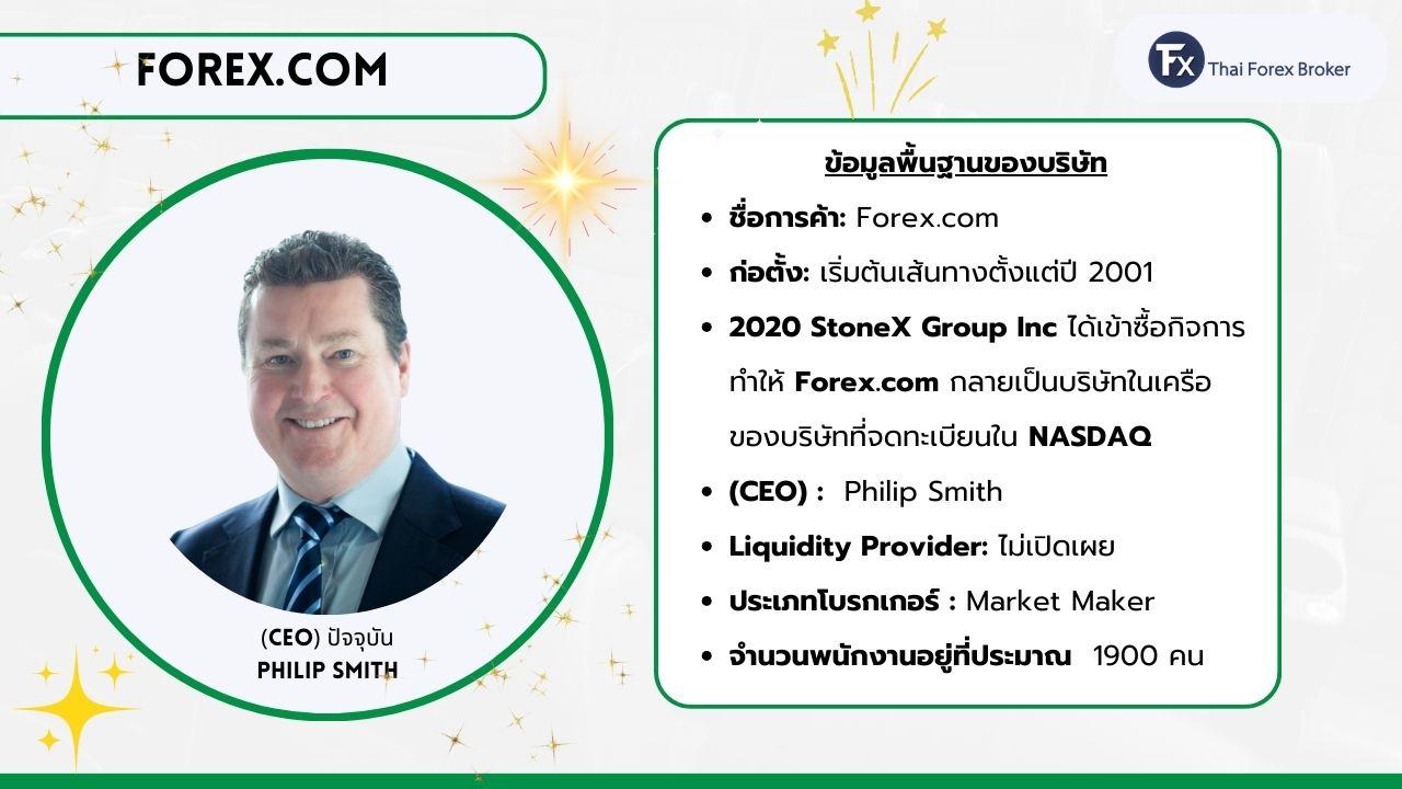 - ปัจจุบัน Forex.com อยู่ภายใต้ StoneX Group Inc. โดยมี Philip Smith เป็น CEO ของกลุ่ม ซึ่งถือเป็นผู้บริหารหลักที่กำหนดทิศทางองค์กรครับ