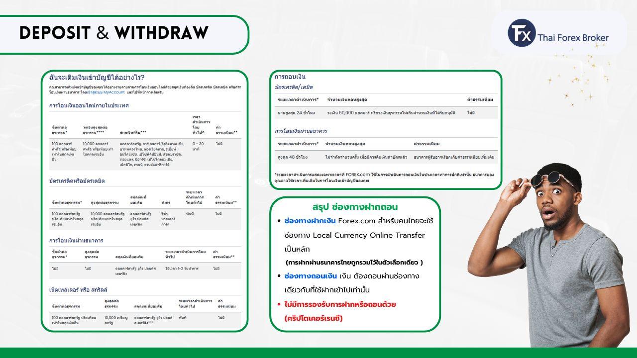 - จากที่ผมดูข้อมูลแล้ว การฝากถอนของ Forex.com สำหรับคนไทยจะใช้ช่องทาง Local Currency Online Transfer เป็นหลัก ซึ่งมีตัวเลือกสกุลเงิน THB ให้ใช้งาน ทำให้รู้สึกว่าสะดวกขึ้นพอสมควรเวลาโอนเงินครับ