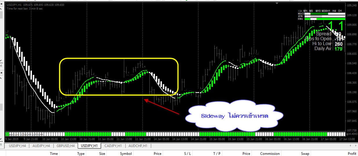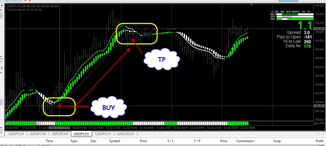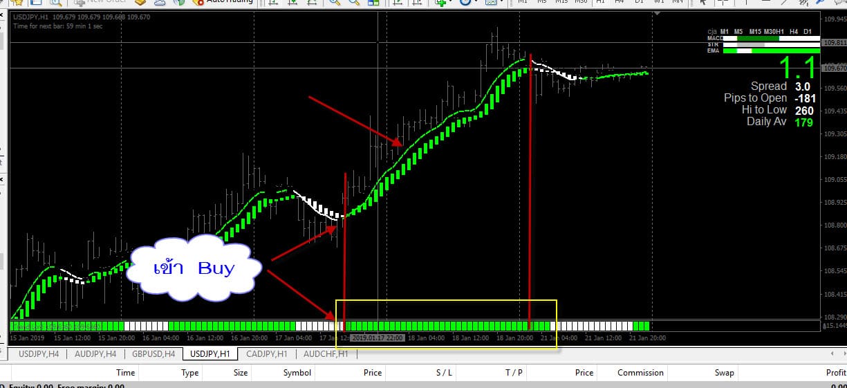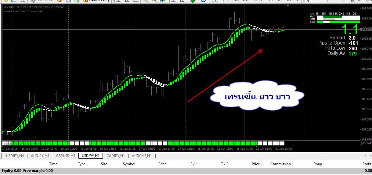 เรายังอยู่ในวันที่ 17-01-2019 กันอยู่ สัญญาณ Buy ปรากฏแล้ว TrendLord เป็นสีเขียว , – Heiken Ashi Smootedline แท่งเปลี่ยนเป็นสีเขียว , – MA in Color เส้นเปลี่ยนเป็นสีเขียว เข้า Buy ที่ราคา 108.807 รอบนี้ถือไว้ 34 แท่ง 34 ชั่วโมง = 1 วัน 10 ชั่วโมง ออกที่ราคา 109.647 บวกมา 84 pips ถ้าเราใช้บัญชี STD แล้วใช้ lots = 0.01 ก็จะได้กำไร 8.4 $ ก็ไม่เลว สำหรับรอบนี้ เทรน ยาว ยาว …