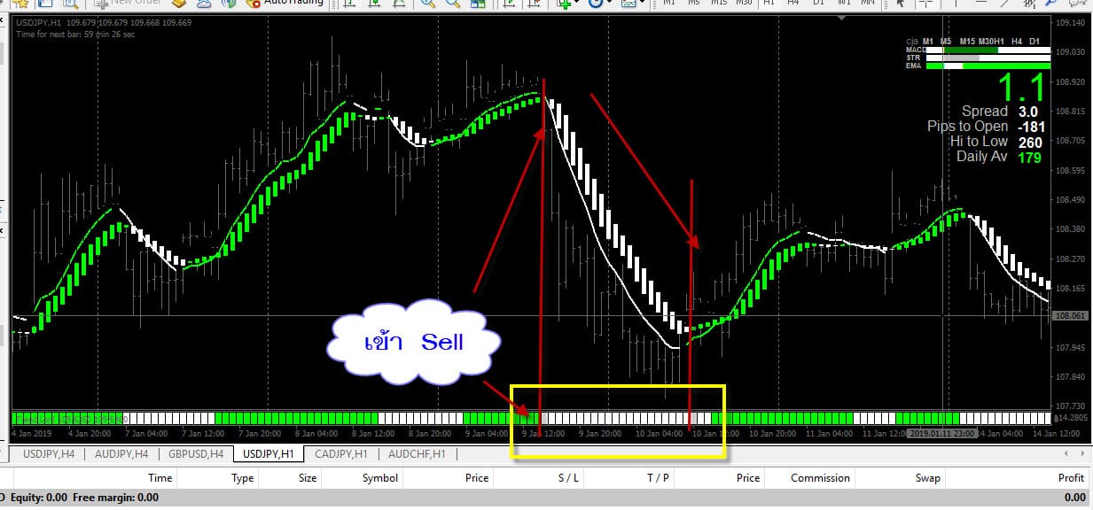 จัด เลย Sell ที่ราคา 108.977 ถือไว้ จนพบสัญญาณออก ที่ราคา 108.84 ใช้เวลา 9 แท่ง ก็ 9 ชั่วโมง บวกมา 13.7 pips ถ้าเราใช้บัญชี STD แล้วใช้ lots = 0.01 ก็จะได้กำไร 1.37 $ ใน 9 ชั่วโมง พอดี รอบนี้ สัญญาณสั้น ไม่ยาว
