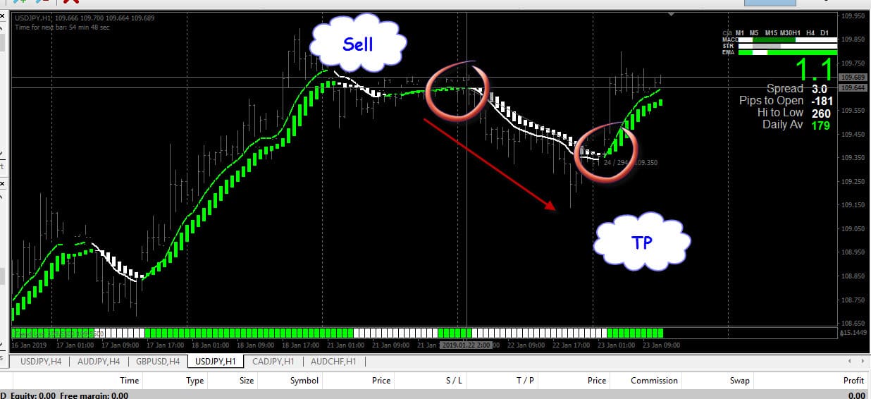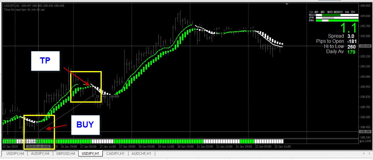 เราถอยกราฟมาวันที่ 16-01-2019 เข้า Buy ที่ราคา 108.399 ถือไว้ จนพบสัญญาณ ออก ใช้เวลา 23 แท่ง ออกที่ราคา 108.859 บวกมา 46 pips ถ้าเราใช้บัญชี STD แล้วใช้ lots = 0.01 ก็จะได้กำไร 4.6 $ ใน 1 วัน ก็ไม่เลวเลยใช่ไหมครับ ใช้กราฟ 1 hr กำไรก็จะประมาณนี้อ่ะครับ