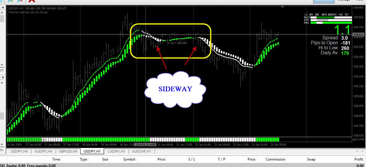 ภาพแสดง กราฟ sideway ซึ่ง ไม่ควรเข้าเทรด ตามคำแนะนำของ เว็บฝรั่ง ทีนี้มาดูว่าจังหวะที่จะเข้า ไม้ buy และ ไม้ Sell นั้นต้องดูสัญญาณ จาก อินดี้ตัวไหนกันบ้าง