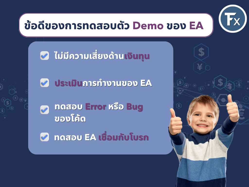 - ตัว EA ที่วางขายส่วนใหญ่จะมีเวอร์ชั่น Demo ให้เทรดเดอร์เอาไปลองใช้งานดูก่อน ขอแนะนำว่า…ควรใช้ Demo อย่างต่ำ 3 เดือนเพื่อเช็คประสิทธิภาพก่อนซื้อจริง