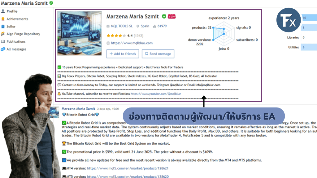 - ก่อนจะซื้อ EA สิ่งสำคัญที่เราต้องดูก็คือใครเป็นคนสร้าง EA ตัวนี้มีช่องทางติดต่อทางไหนบ้าง ควรจะเก็บช่องทางติดต่อทั้งหมดไว้