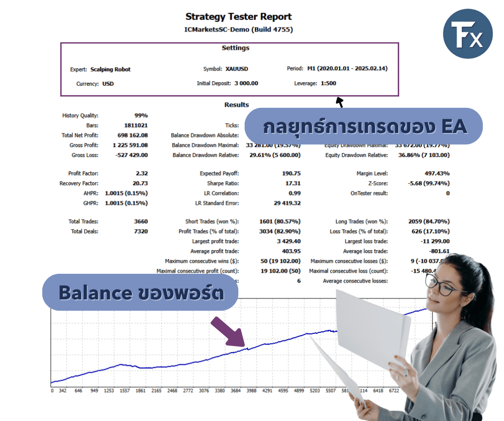 - Backtest ควรมีช่วงเวลาทดสอบย้อนหลังอย่างน้อย 1-2 ปี มีกราฟแสดงการเติบโตของพอร์ต, Drawdown, Win Rate และจำนวนเทรดสม่ำเสมอ ยิ่งเปิดเผยรายละเอียดมากยิ่งดี