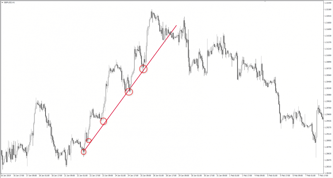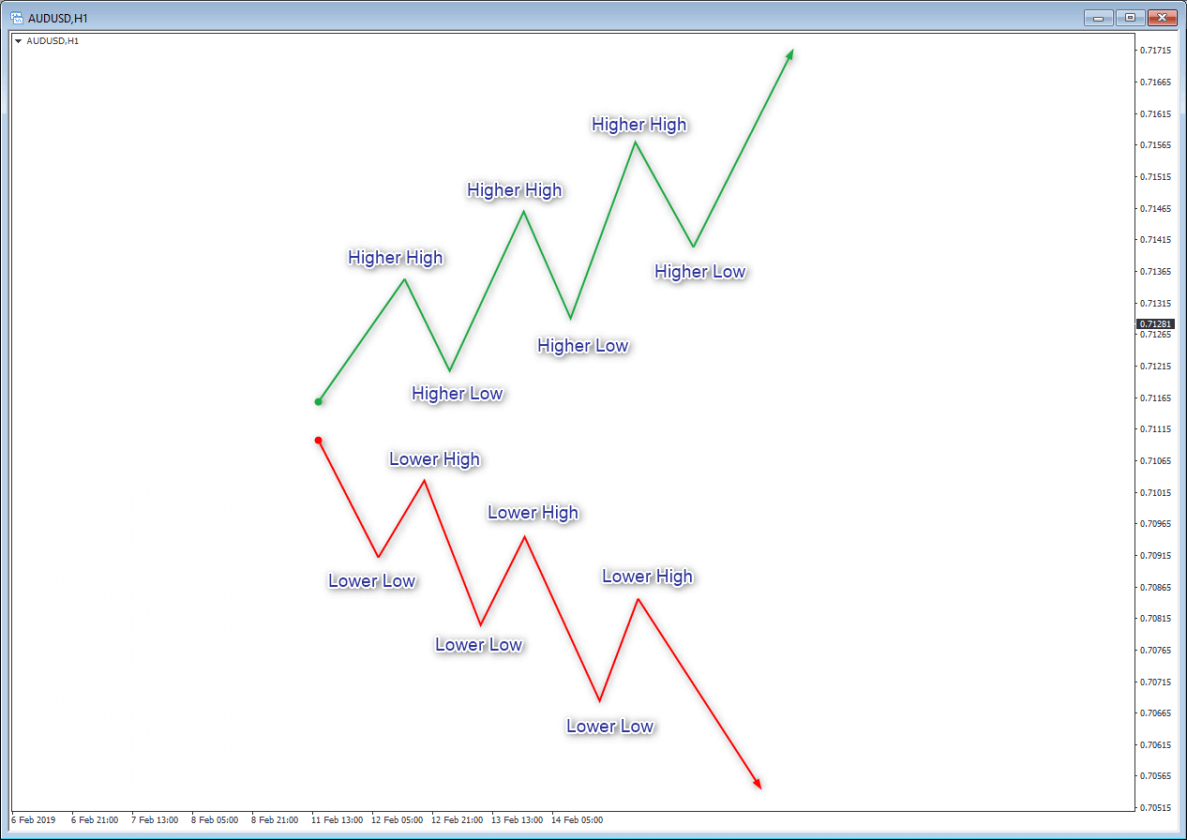 ก่อนจะดูออกว่าเทรนยังแข็ง (trend strength) เพียงพอที่จะเทรดหรือเปล่า จำเป็นต้องเข้าใจว่าลักษณะของตลาดที่กำลังทำเทรนมีอะไรบ้าง – ตลาดที่กำลังทำเทรนคือตลาดที่ทำ higher highs ตามด้วย higher lows ได้สำหรับเทรนขาขึ้น หรือตลาดที่ทำ lower lows ตามด้วย lower highs สำหรับเทรนขาลง