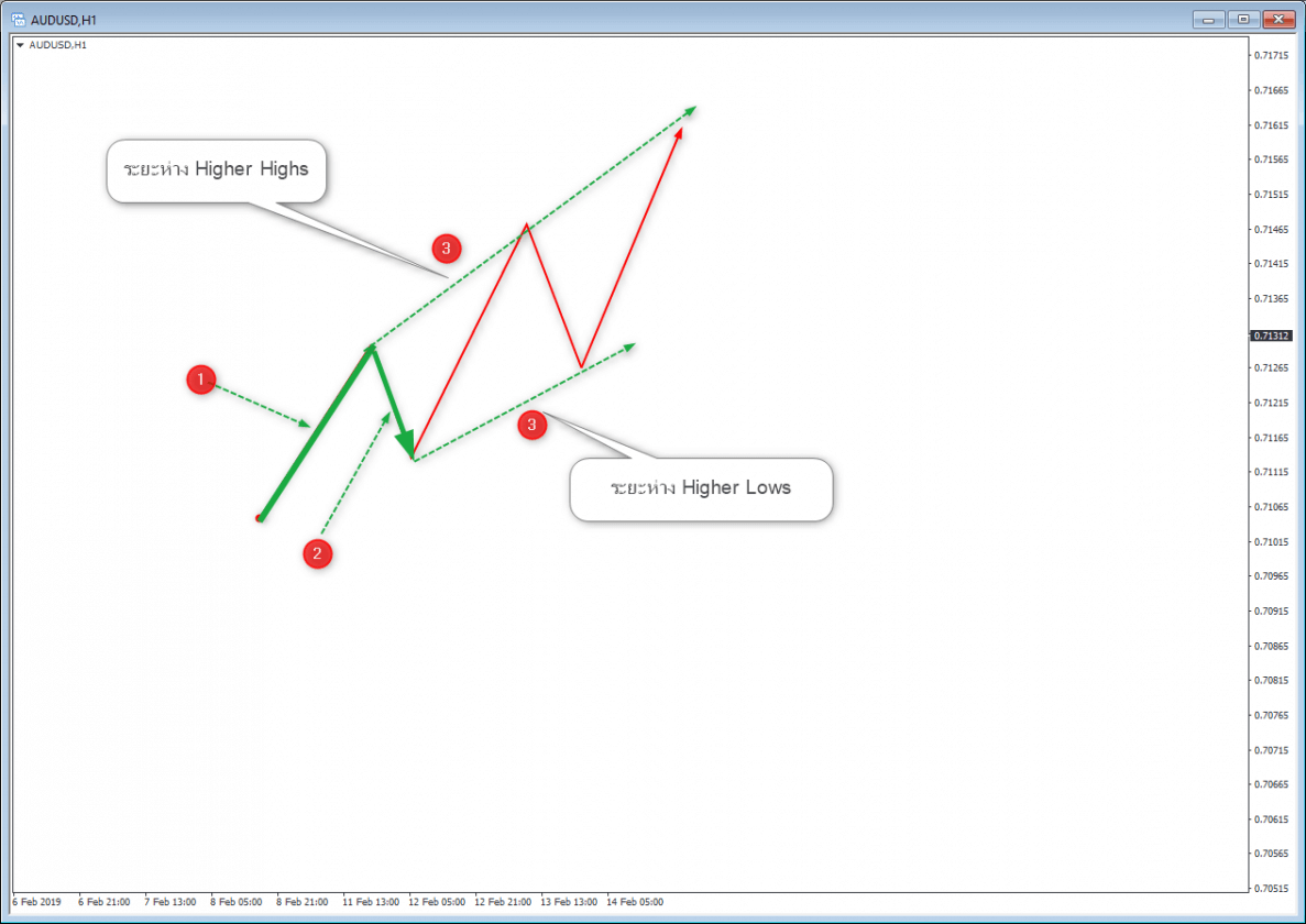 เทียบกับชาร์ตนี้ ท่านจะเห็นว่าระยะห่าง higher lows สูงขึ้น และห่างกันเยอะ ตามหลัง higher highs ที่เอาชนะพื้นที่ฝั่งตรงข้ามไปด้วย ทำให้จุด higher lows เป็นจุดอ้างอิงพวกที่เข้าเทรดตามเทรดได้เพราะเทรดเดอร์พวก trapped traders ประกอบที่จุด pullback สำหรับเทสเทรนด้วย
