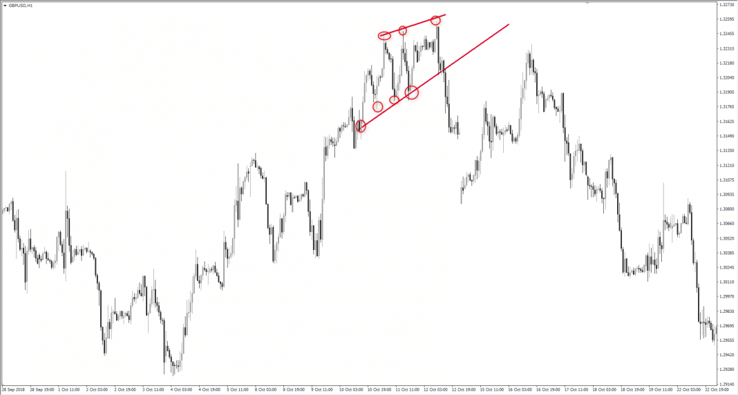 ตัวอย่างนี้ท่านจะเห็นระยะห่าง higher highs ไม่ห่างกันมาก และระยะห่างสูงขึ้นของ higher lows ก็ไม่ห่างกันมากอยู่พื้นที่เดียวกัน สุดท้ายราคาก็เบรดลงล่าง ทำไมราคาถึงเป็นแบบนี้ ถ้ามองรูปท่านจะพบว่าระยะห่างไม่มากแบบที่บอก แต่ถ้าท่านเอาเรื่องออเดอร์เข้าไปอธิบายด้วยจะได้ข้อมูลชัดขึ้น แม้ว่าราคาจะดันขึ้นไปจริงท่านจะพบว่า higher highs สูงกว่ากันไม่มาก แสดงว่า buy market orders พวกนี้ไปเจอ sell limit orders ที่มากพอพื้นที่นั้นๆ แสดงว่าเป็นการล่า stop ordes เพื่อเข้าตลาด และดูส่วนที่ทำ higher lows ราคก็อยู่พื้นที่เดียวกัน พอราคาขึ้นไปทำ higher highs ราคาลงมาทำ hihger lows ที่ราคาไม่ห่างจากจุด higher lows ก่อนมาก บอกว่าพื้นที่ตรงนี้ buy limit orders หรือ unfilled buy orders ใช้ไปแล้ว เลยทำให้ buy limit orders น้อย เมื่อเห็นลักษณะ higher highs ที่ตามด้วย higher lows แบบนี้ต้องระวัง ราคากำลังบอกว่าอะไรจะเกิดขึ้น แค่รอเวลาผ่านมาพอราคาเบรคเส้น trendline ด้านล่างจะเห็นชัดว่าพวก trapped traders ต้องออกจากตลาด