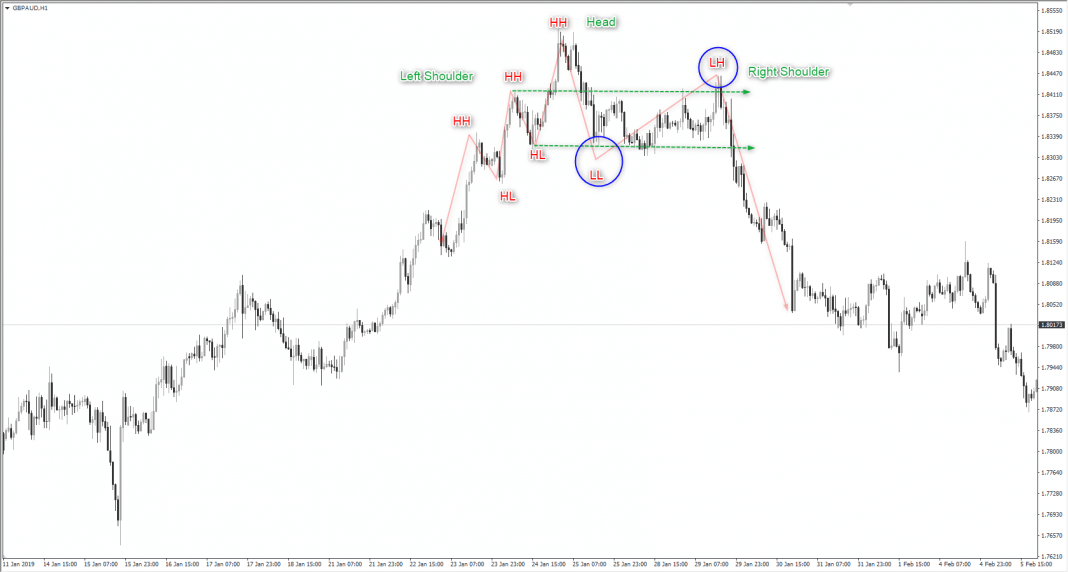 เทรนขาขึ้น – higher high, higher low, higher high, higher low ถือว่าปกติ แต่พอราคาทำ lower low ตามด้วย lower high – ทำให้โครงสร้งการพัฒนาเทรนเปลี่ยนไป ราคากำลังสื่อข้อมูลบางอย่าง และพอราคาเบรคตรงส่วนเส้นล่างที่เทรดเดอร์ที่แนว Head and shoulders จะเรียกว่า neckline เป็นจุดที่ความรู้ทั่วไปในเรื่องนี้สอนให้เข้าเทรด เลยเป็นราคาวิ่งลงแรง – โครงสร้างเทรนที่เปลี่ยนแบบนี้จะเป็นส่วนหนึ่งของกลยุทธของขาใหญ่ที่ต้องการเข้าตลาดเพราะอย่างกรณี head and soulder เป็นชาร์ตแบบ reversal pattern จะเกิดหลังจากที่ราคาวิ่งมาเยอะจนทำให้เทรดเดอร์ที่รอเข้าเกิด bias ไปทางนั้นๆ เปิดโอกาสให้ขาใหญ่ได้ใช้ประโยชน์จากออเดอร์ที่จะเกิดขึ้นจากจุดพวกนี้ เพื่อเข้าตลาดที่ราคาที่ดีกว่าและมั่นใจเรื่อง liquidity จากออเดอร์ฝั่งตรงข้ามมากพอจำนวนออเดอร์ที่พวกเขาต้องการเข้าเทรด