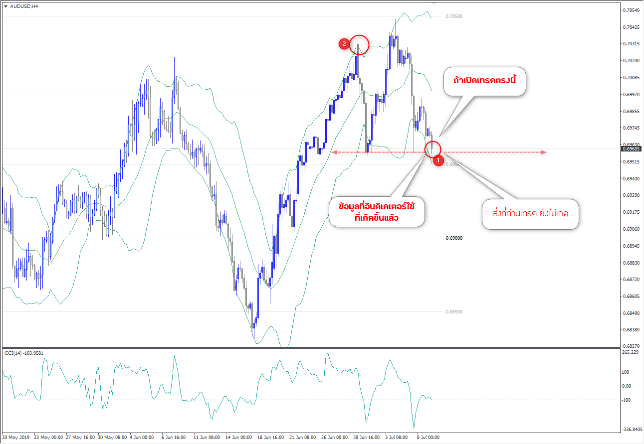 และอินดิเคเตอร์ก็ทำงานแม่นหมด เพราะส่วนหลังที่เกิดหลังเลข 2 ถ้าข้อมูลราคเปลี่ยนไป ส่วนของอินดิเตอร์ก็จะเปลี่ยนไปได้ ท่านก็จะเห็นภาพตรงที่เลข 2 ต่างออกไปจากที่แสดง ดังนั้นต้องรู้ว่าอินดิเคเตอร์ทำงานอย่างไรก่อน