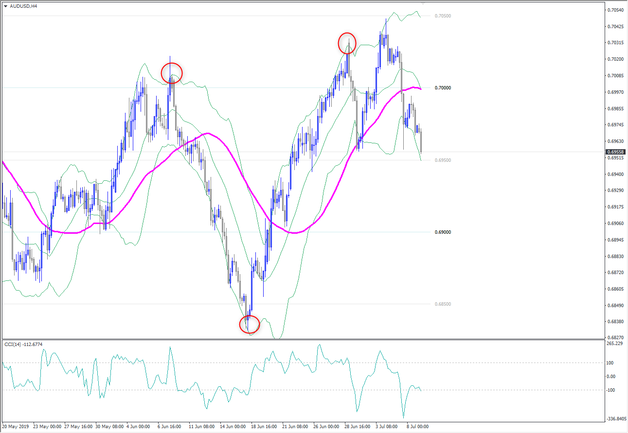 และใข้ CCI เป็นตัวช่วยยืนยันหรือเป็น Oscillator ว่าราคาอยากไปทางที่เปิดเทรดหรือเปล่า บางเทรดเดอร์อาจใช้ Moving Average (MA) เป็นตัวกำหนดเทรนเข้าไปอีกก็ได้ หลายๆ ตัวช่วยยืนยันเข้าไป เช่นอย่างในภาพใช้ MA 50 เช่นเมื่อดู Bollinger Bands เป็นราคาอยู่ส่วนที่เป็นกรอบ upper band หรือ lower band อินดิเคเตอร์ก็บอกเทรน
