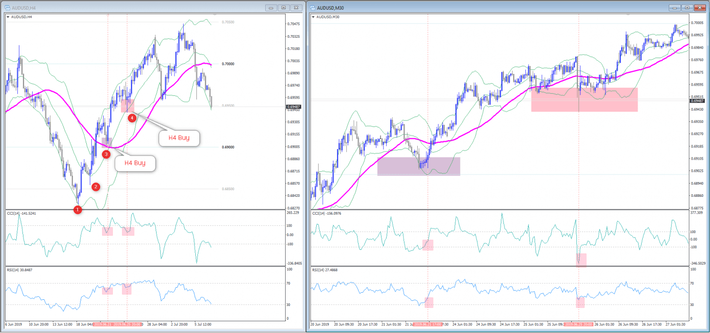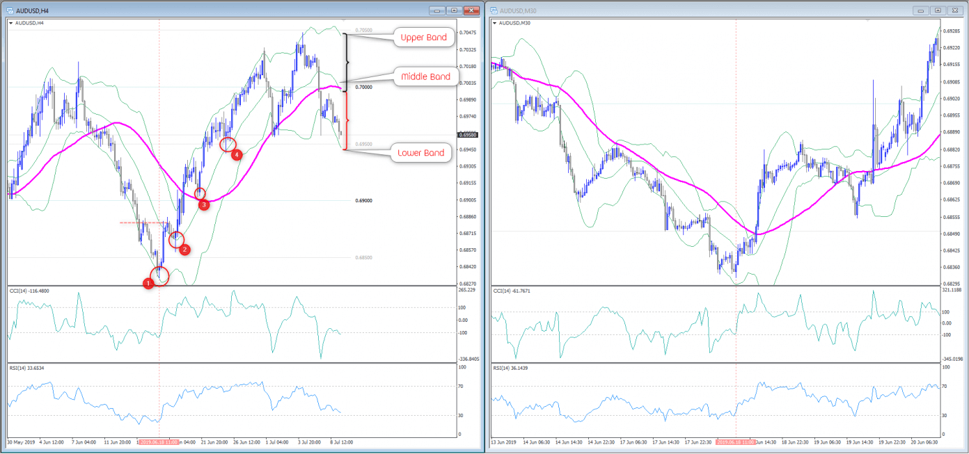 ดังนั้นเมื่อท่านเลือกที่จะเทรดตามเทรน สิ่งที่ต้องการคือว่าต้องเห็นเทรนเกิดขึ้นก่อน แต่พอท่านใช้อินดิเคเตอร์ชุดเดียวกันประกอบที่ M30 ท่านจะเห็นว่าเงื่อนไขได้ เช่นที่เลข 3 ราคาอยู่ในกรอบ upper band ราคาลงมาทดสอบที่เส้น middle band แล้วเด้งขึ้น บอกถึงความเป็นไปได้ที่เทรนจะทำต่อตามหลังที่เลข 1 และ 2 ได้เบรคเทรนขึ้นมา