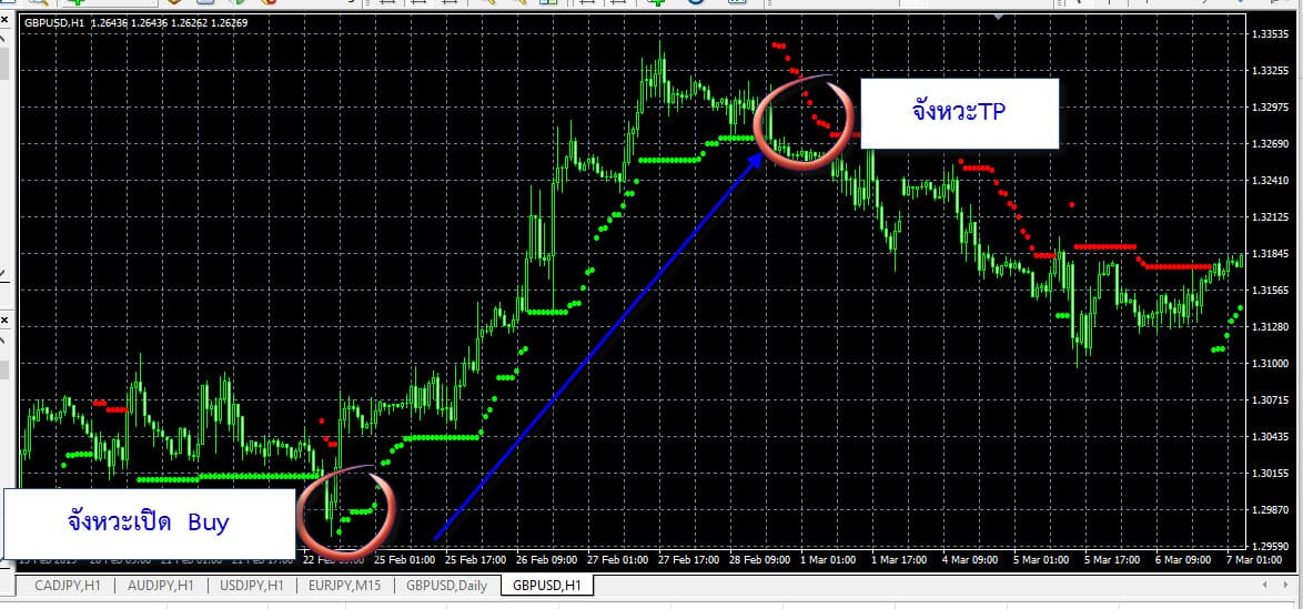 จังหวะการเปิด  Buy => แท่งกราฟอยู่เหนือเส้น แนวรับสีเขียวและเหนือจุด parabolic sar สีเขียว
