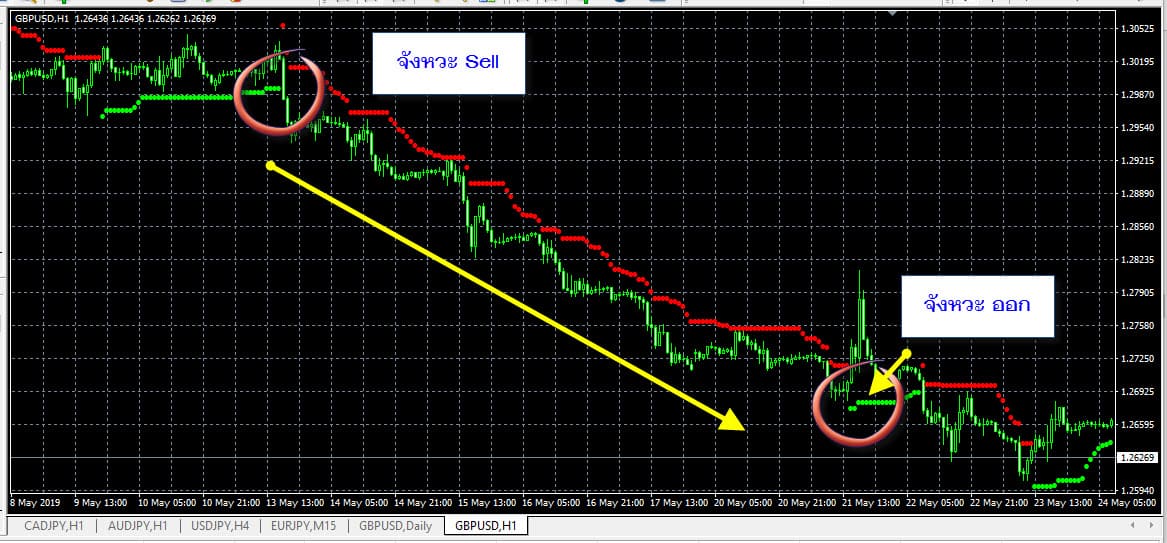 จังหวะการเปิด  Sell => แท่งกราฟอยู่เหนือเส้น แนวต้านสีแดงและใต้จุด parabolic sar สีแดง