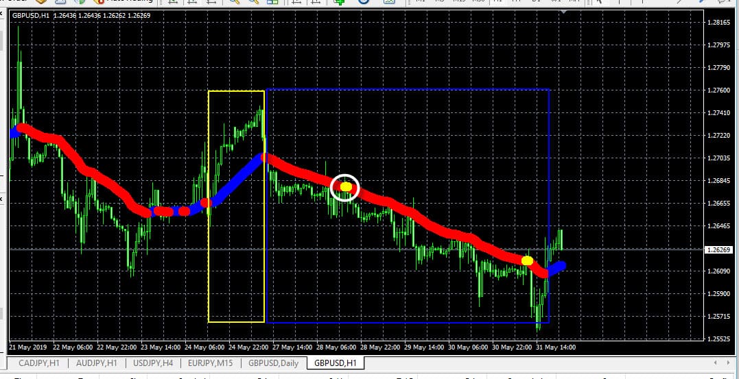 ภาพแสดงจังหวะการเปิด ออร์เดอร์  Buy  เราเปิด ออร์เดอร์ตรงบริเวณวงกลมสีแดง ได้เลย แล้วถือรอไป จุด  TP  ที่ สัญญาณเปลี่ยนเทรน รอบนี้ขึ้นยาว บวก กระจาย