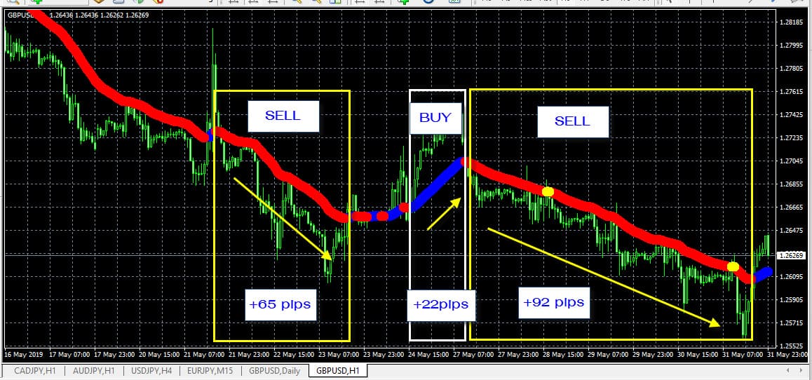 หลักเกณฑ์ง่าย ๆ ครับ ตามหลัก MA Cross  =>  เส้น MA8 ตัดขึ้น MA21  เปิด  Buy , เส้น MA8 ตัดลง MA21 เปิด Sell  ส่วนตัวนะครับ ใช้กับกราฟ H4  นี่ เหมาะแล้วครับ เก้บนาน ๆ ถือยาว ๆ บวกกระจาย .. ปลอดภัย .. มาดูจังหวะเปิด ออร์เดอร์  Buy , Sell ในภาพด้านล่างกันเลย