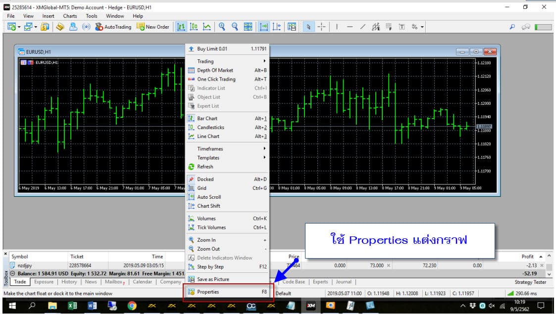เมนู เปลี่ยน ชนิดกราฟ => Candle , bar , line ถัดมาก็ เมนู Zoom in , ZoomOut
