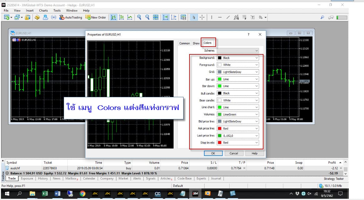 เลือกปรับแต่งสีของแท่งกราฟ ให้ถูกจริตของเรา ส่วนตัวผม ใช้ Bull Candle => สีเขียว , Bear Candle => สีแดง .. ตามพิมพ์นิยม จัดให้ ..