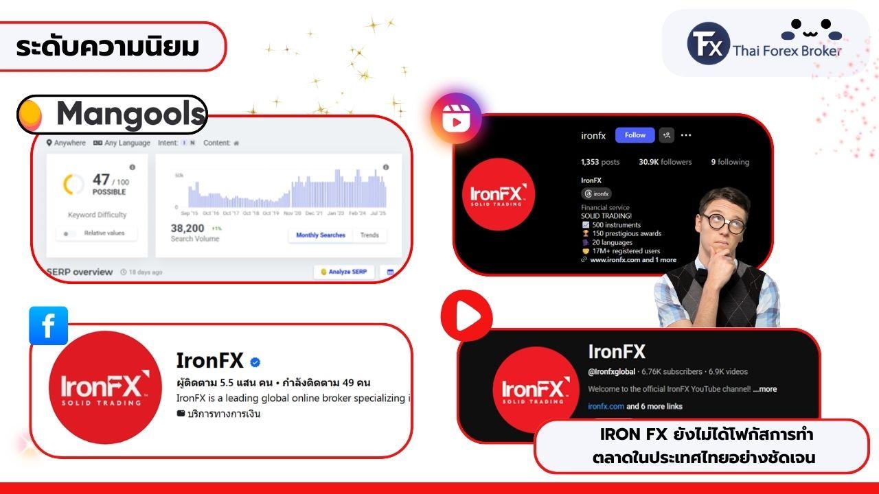 - จากข้อมูลยอดค้นหาในไทยประมาณ 100 ครั้งต่อเดือนเมื่อค้นคำว่า IronFX ทำให้ผมรู้สึกว่าความนิยมในตลาดไทยยังอยู่ในระดับค่อนข้างเฉพาะกลุ่ม ไม่ได้เป็นโบรกเกอร์ที่ถูกพูดถึงกว้างขวางมากนักครับ