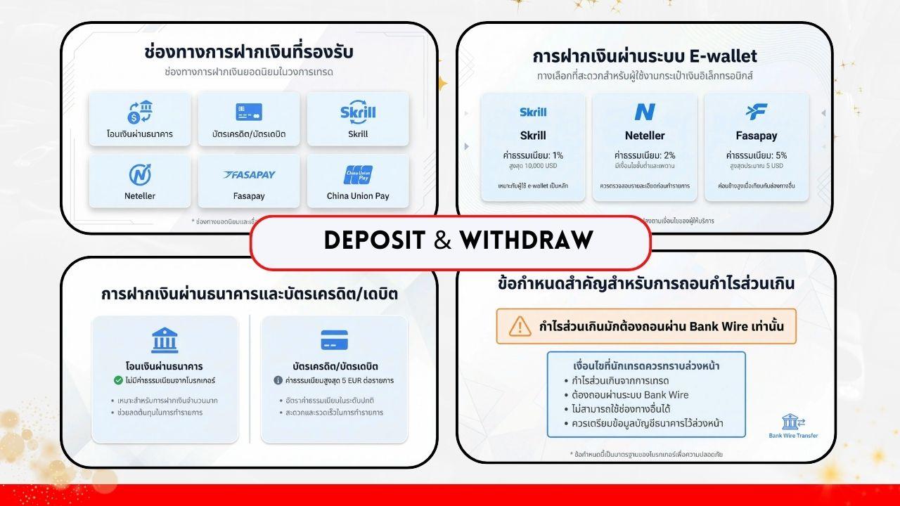 - ช่องทางฝากที่รองรับ ได้แก่ โอนเงินผ่านธนาคาร, บัตรเครดิต/บัตรเดบิต, Skrill, Neteller, Fasapay และ China Union Pay ซึ่งถือว่าเป็นช่องทางยอดนิยมในวงการเทรดครับ