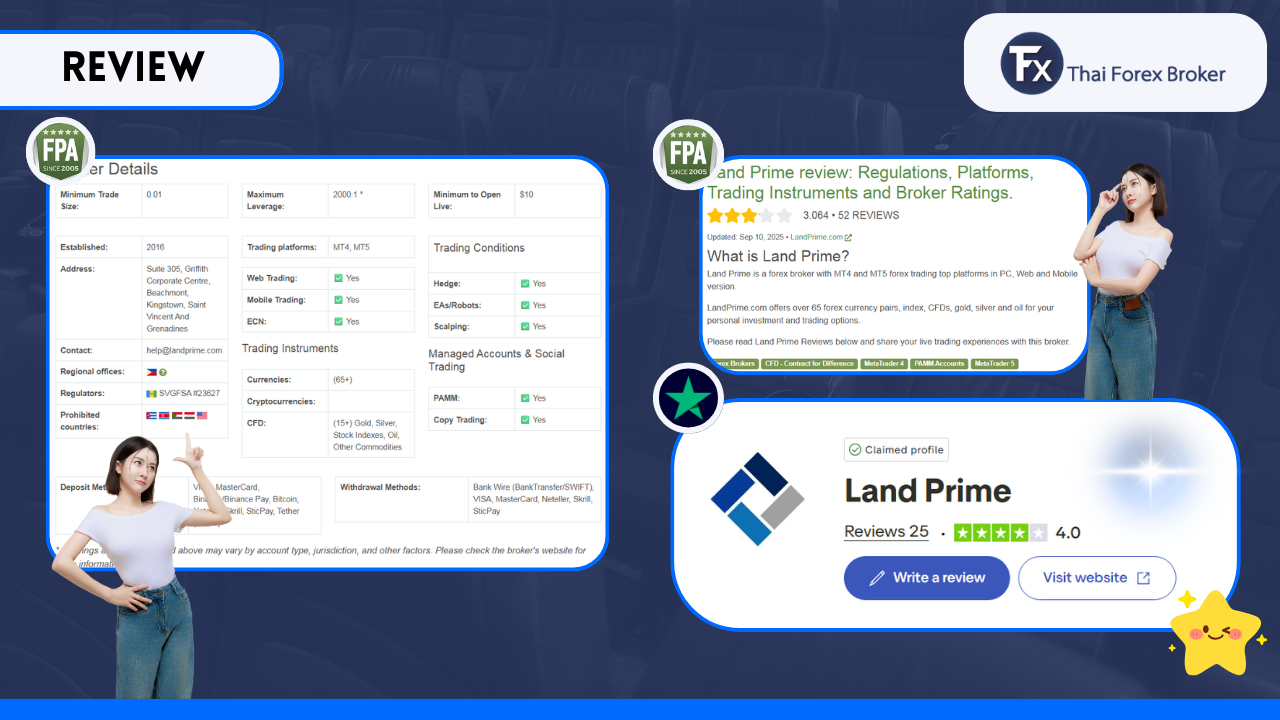 - ThaiBrokerForex. (n.d.). รีวิวโบรกเกอร์ Land Prime (LAND-FX). Retrieved from https://thaibrokerforex.com/broker-land-fx-review/