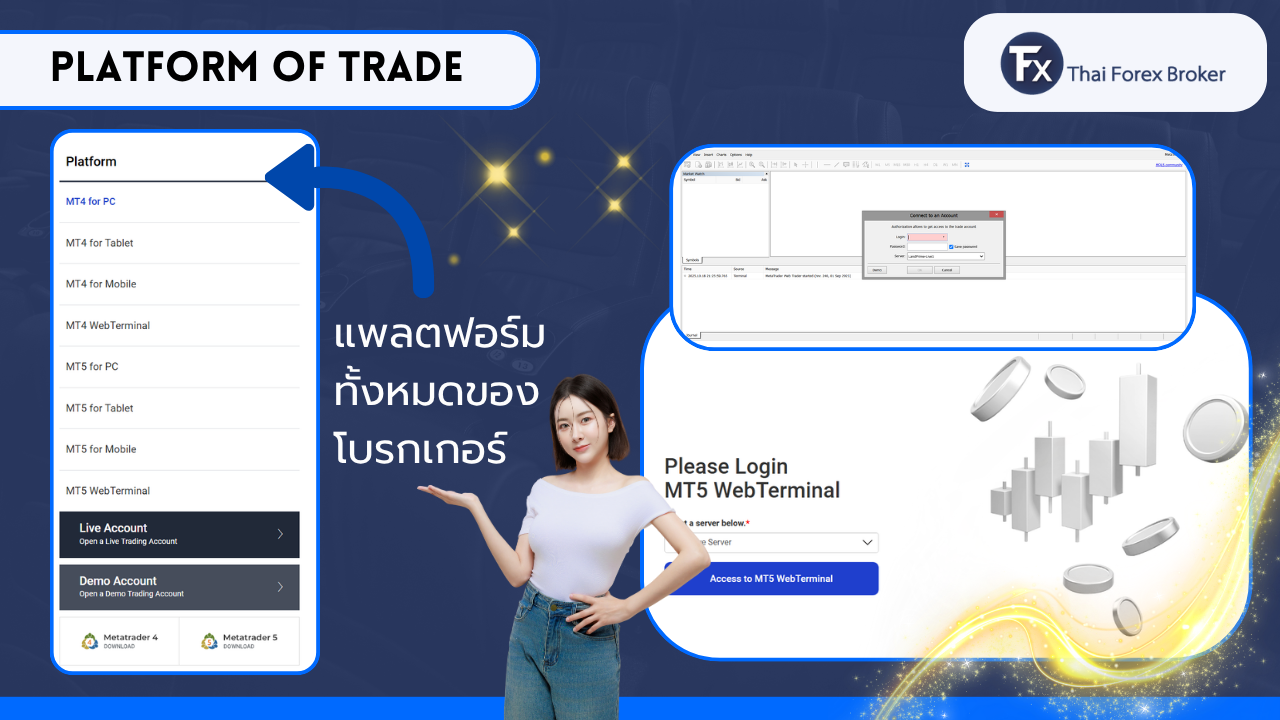 เป็นแพลตฟอร์มที่ได้รับความนิยมมากที่สุดในวงการเทรด Forex จุดแข็งของ MT4 คือความเสถียร ใช้งานง่าย และรองรับอินดิเคเตอร์จำนวนมาก เหมาะสำหรับมือใหม่ที่อยากเริ่มต้นเทรดแบบไม่ซับซ้อนครับ - MetaTrader 5 (MT5) สำหรับ PC, Tablet และ Mobile