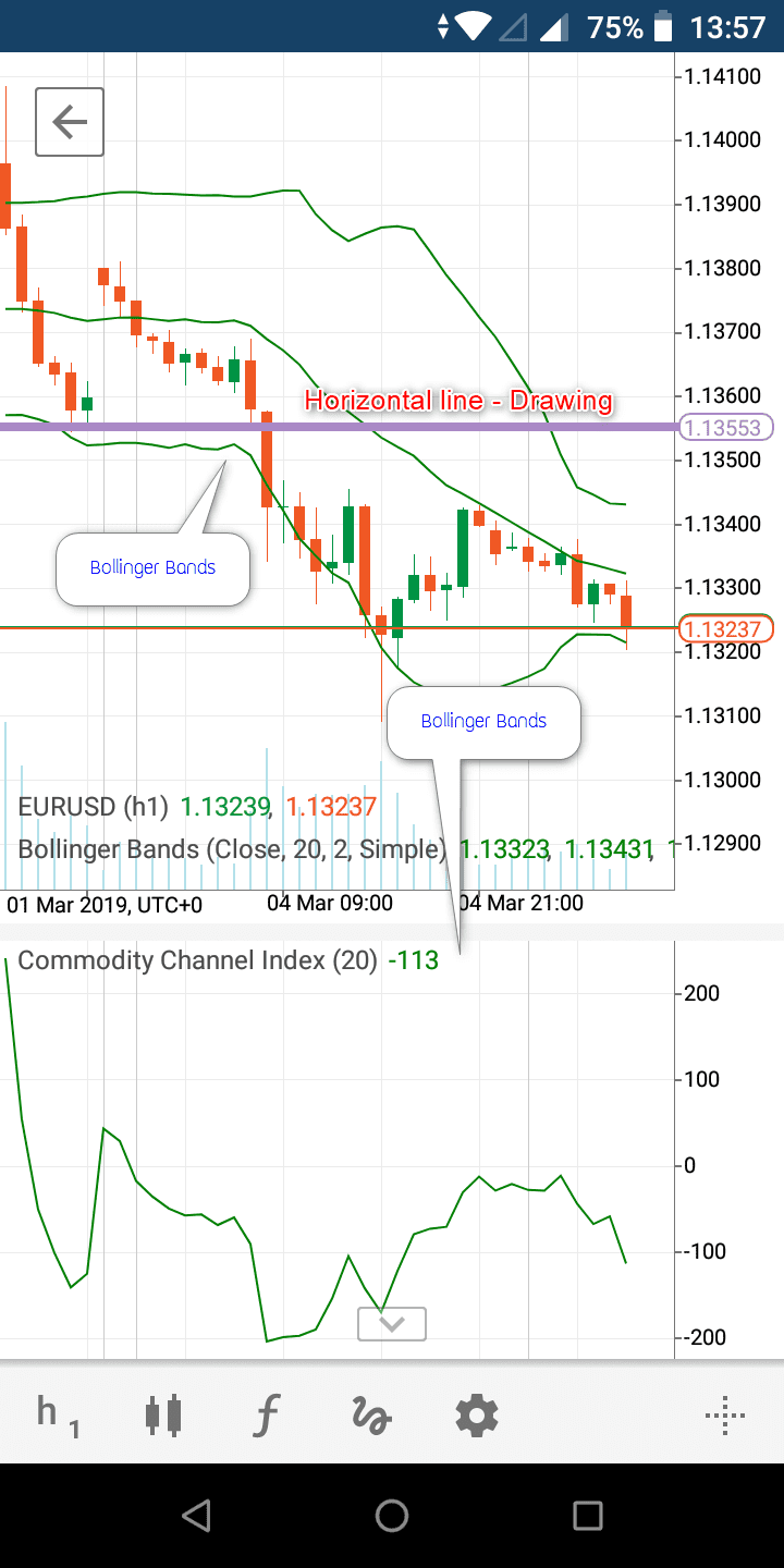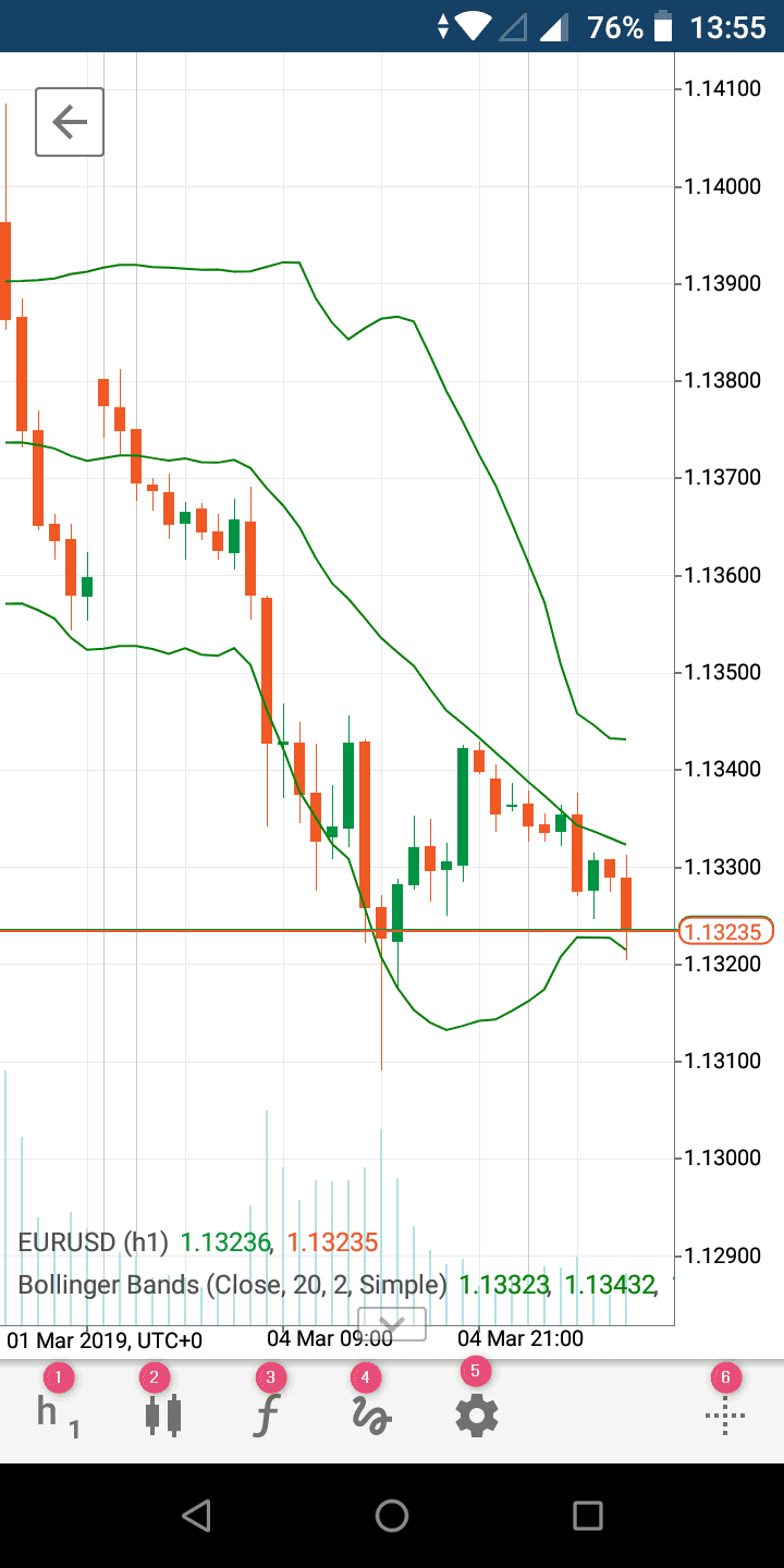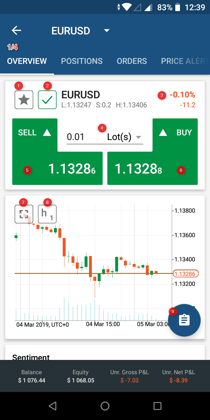 ส่วน 2 – Charts ก็จะมีที่เลข 7 เพื่อเปลี่ยนเป็น Full-screen และเลข 8 ก็จะให้เปลี่ยน timeframes ในส่วนชาร์ต ถ้ามี positions หรือ orders ก็จะแสดงด้วย และเลข 9 สำหรับ Create order ให้ท่านเทรด market order หรือกำหนด pending orders (sell limit, buy limt, sell stop, buy stop, sell stop limit, buy stop limit) ได้ ส่วนที่เพิ่มเติ่มเข้ามาคือเมื่อท่าน tap เพื่อเข้า full screen mode จะมีไอคอนสำหรับ tap ด้านล่างเพื่อเปลี่ยน timeframe เปลี่ยนประเภทชาร์ต (Bar Chart, Candlesticks, Line Chart, Dots Chart และ Area) เพิ่มหรือลบอินดิเคเตอร์ เพิ่มหรือลบ Drawings (ใน Metatrader ใช้คำว่า objects สำหรับส่วนนี้) และสุดท้าย settings สำหรับแสดง Ask Price Line, Bid Price Line, Grid, Period Separators และ Tick Volumne หรือเปล่า และ crosshair ด้านขวาสุด