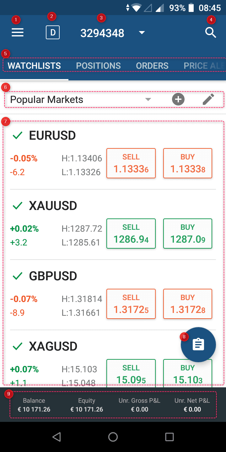 เลข 6 จะเป็น Watchlist (ถ้าเทียบกับของ Metatrader จะเป็น Market watch) เมื่อท่าน tap ที่ชื่อก็จะแสดงรายการ whatlishs อื่นๆ ขึ้นมา ไอคอน + เมื่อต้องการเพิ่ม Watchlist และ ไอคอนดินสอ เมื่อต้องการแก้ไข Watchlist