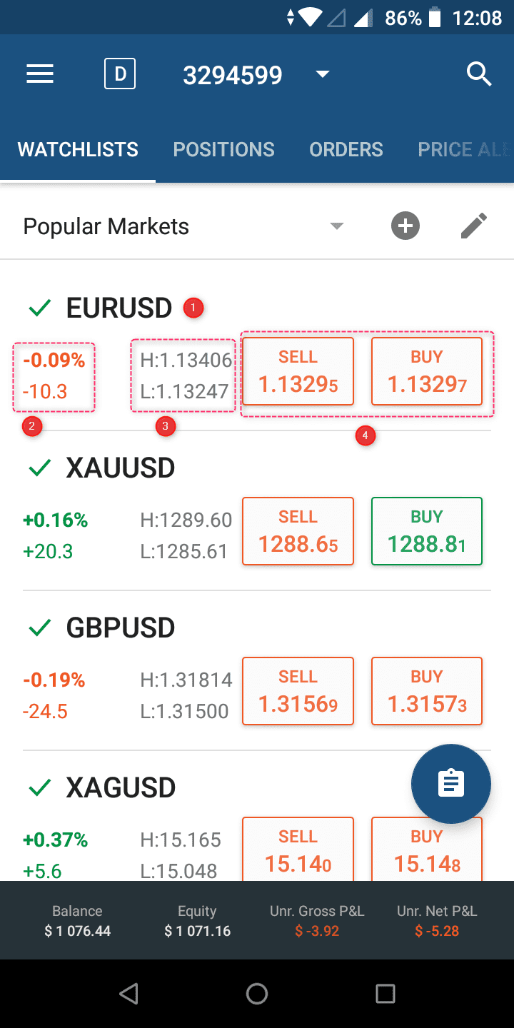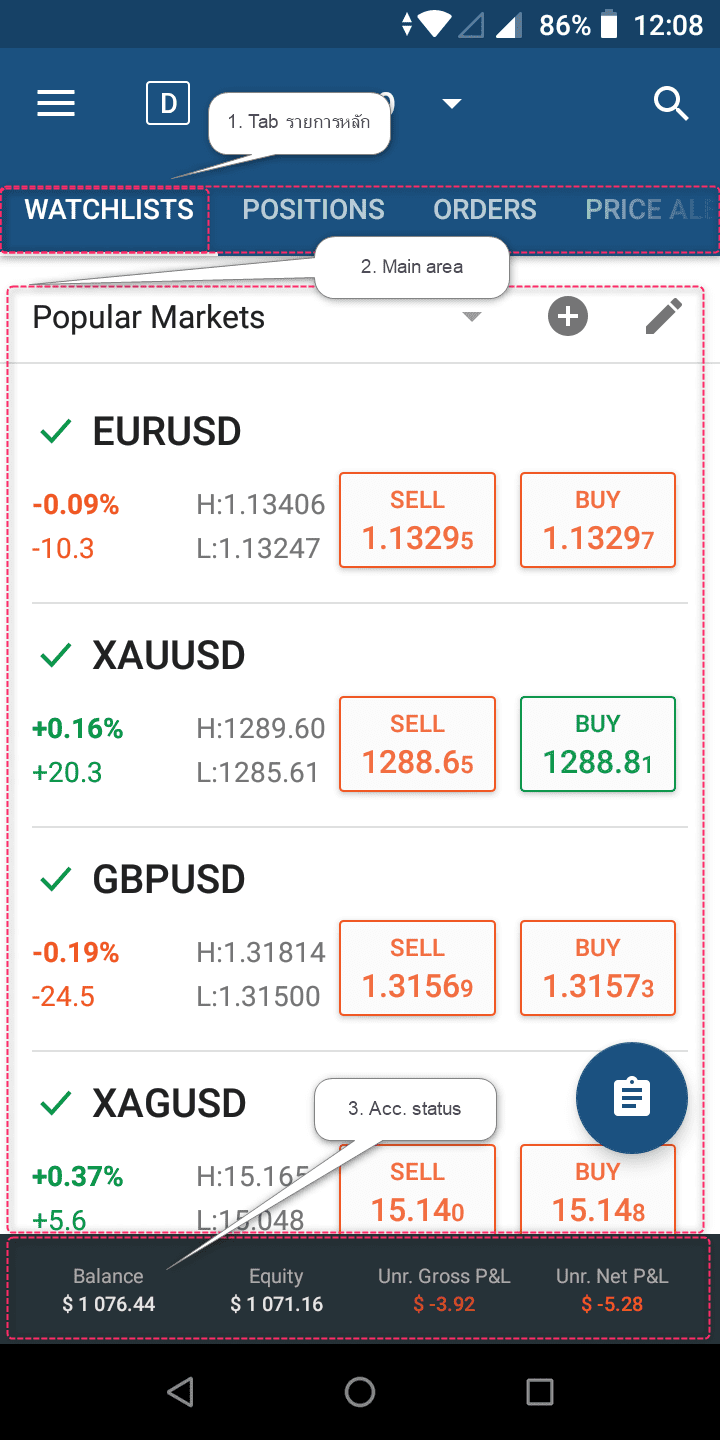 ส่วนแรก WATCHLISTS ให้ท่านเลือกคู่เงินที่ท่านทำการเทรด แบบแยกเป็น watchlist เพื่อให้ท่านง่ายต่อการเข้าถึงและไม่ได้จำกัดว่าท่านจะสร้าง watchlists เท่าไร และก็ไม่ได้จำกัดจำนวนคู่เงินแต่ละ watchlist ด้วย โดยเมื่อท่านเปิดโปรแกรมขึ้นมาครั้งแรกจะเป็น default watchlist ใช้ชื่อว่า Popular Markets ท่านสามารถสร้าง Watchlist ใหม่ด้วยการ tap ที่ไอคอน + หรือสามารถ copy รายการ watchlists แล้วเพิ่มหรือลบคู่เงินตามต้องการได้