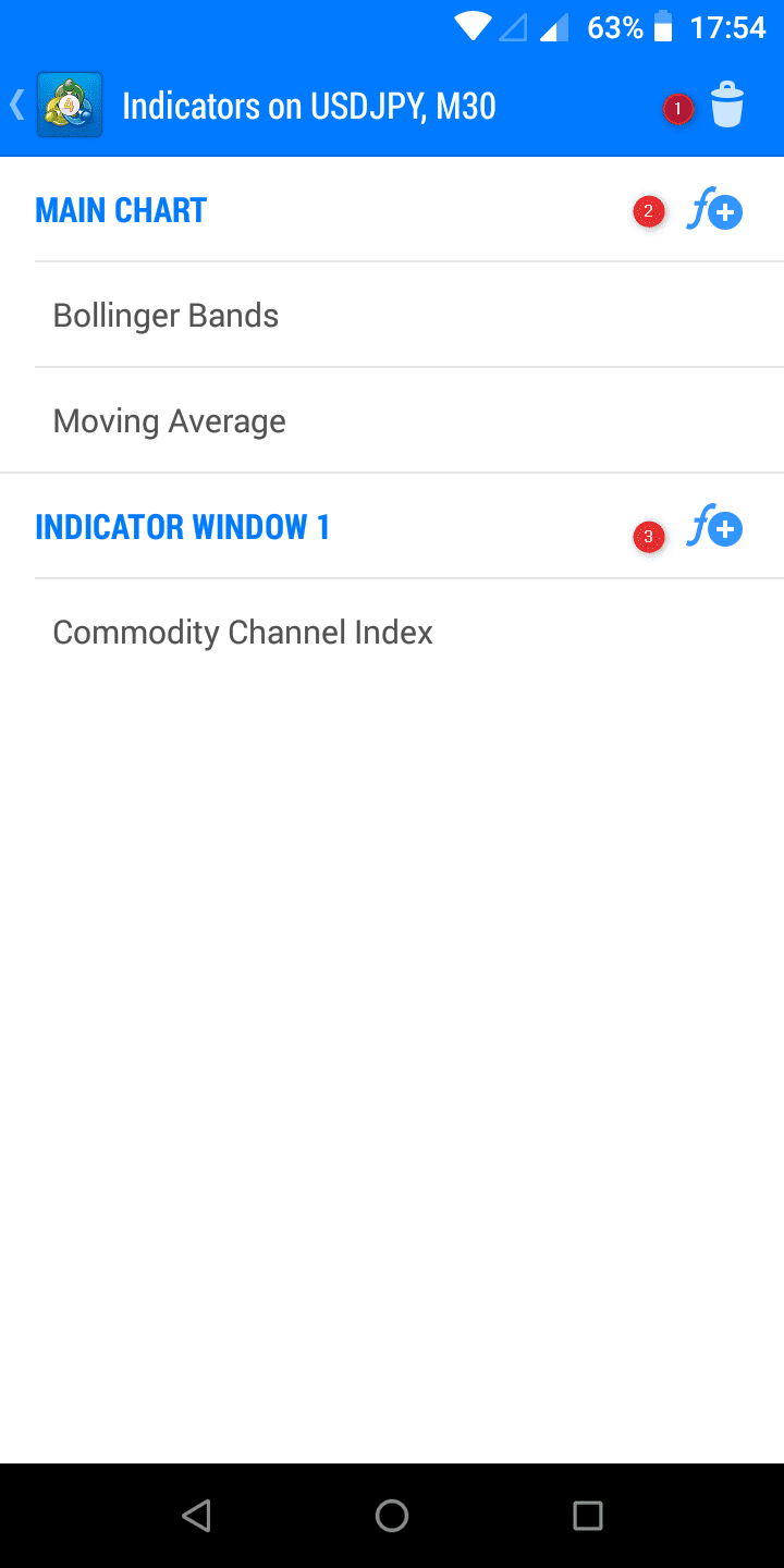 แต่เมื่อท่านใส่อินเคเตอร์ตัวอื่นเพิ่มอีก พอท่าน tap เข้ามาหน้าตาจะเปลี่ยนไปเล็กน้อย ด้านบนจอจะมีไอคอนถังขยะที่เลข 1 ถ้าท่านต้องการลบอินดิเคเตอร์ออกจากชาร์ต ท่านก็ tap แล้วโปรแกรมจะมีให้ท่าน tap เพื่อเลือก และเลข 2 จะเป็นการเพิ่มอินดิเคเตอร์ตัวอื่นเช้ากับชาร์ต เลข 3 เป็นการเพิ่มอินดิเคเตอร์เข้ากับส่วนของอินดิเคตอร์ตัวนั้นๆ