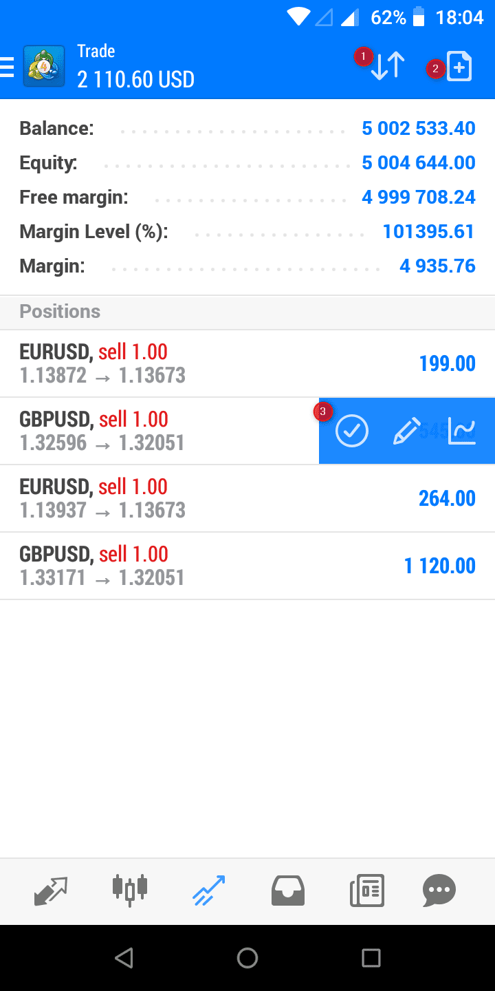 เลข 3 เมื่อท่าน slide ออเดอร์นั้นๆ มาทางขวามือ ไอคอนแรกที่สามารถ tap ได้จะเป็น Close order ไอคอนถัดมาเป็น Modify order และไอคอนสุดท้ายเป็นเปิดชาร์ตคู่นั้นๆ หรือเมื่อท่านกดที่ออเดอร์นั้นๆ ค้างไว้ก็จะมีเมนูขึ้นมา