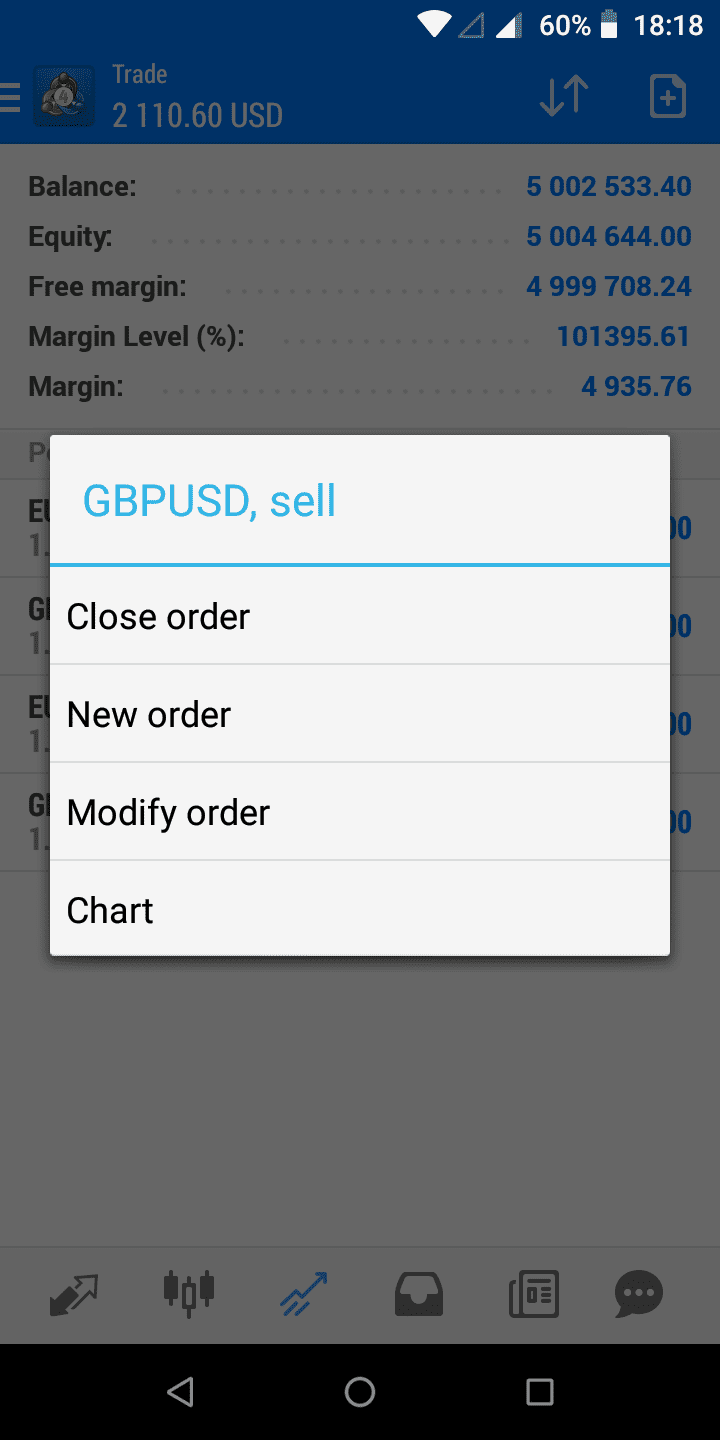 มีรายการคำสั่งให้ท่านเลือก tap คือ Close oder, New order, Modify order และ Chart