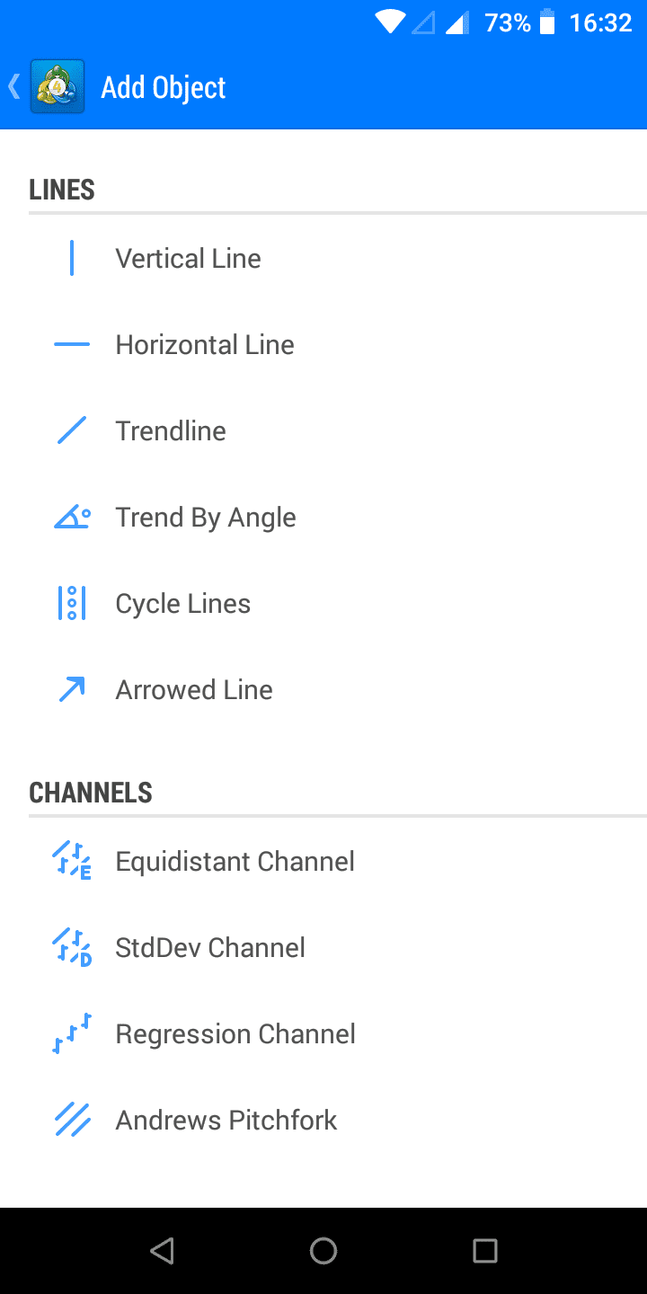 แล้วจะมีรายการ objects ต่างๆ ขึ้นมา แบ่งตามประเภท Lines, Channels, Gann, Fibonacci, Elliott, Shapes