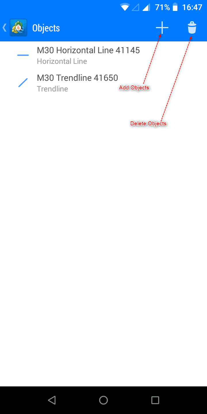 วิธีการใช้ objects ขึ้นกับแต่ละจุดที่เปลี่ยนของแต่ละ objects ยกตัวอย่างเช่น horizontal มีค่าเดียวคือราคา เมื่อท่าน tap เพื่อเลือกแล้ว โปรแกรมจะกลับไปที่หน้าชาร์ต แล้วท่านก็ไป tap ตำแหน่งที่ราคาท่านต้องการ หรือถ้าต้องการเปลี่ยนค่าท่านก็ tap เพื่อเลือก object แล้วก็ลากไปที่ราคาท่านต้องการ หลักการทำงานก็ไม่ต่างจากเวอรชั่น Desktop แต่ใน Mobile edition จะใช้การ tap แทนการคลิกเม้าส์ และกดค้างไว้แล้วลากไปมาแบบใช้เม้าส์ ส่วนการตั้งค่า objects อื่นๆ ท่านก็ tap พื้นที่ชาร์ตแล้ว tap ที่ objects จาก Radial menu จากนั้นก็ tap รายการ object ที่ท่านต้องการปรับเปลี่ยนอื่นๆ แล้วก็ tap ตรงคำว่า DONE ด้านขวาบน