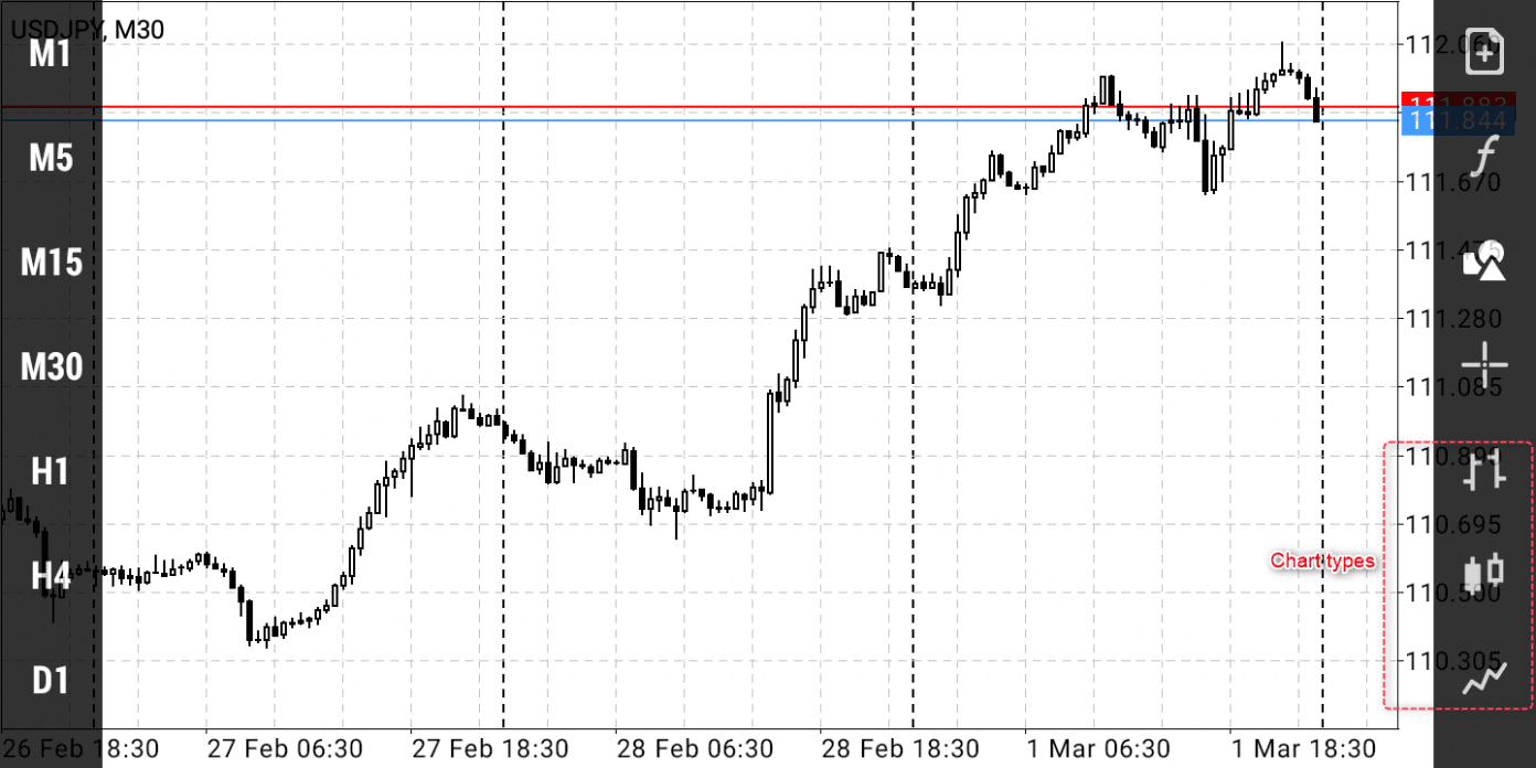 อีกอย่าง เมื่อท่านอยูในโหมดการแสดงชาร์ต เมื่อท่านปรับจอเป็นแนวนอน จะเป็นการเสนอชาร์ตแบบ full screen เมื่อท่าน tap ที่ชาร์ตจะไม่มี Radial Menu แต่มีรายการ อื่นๆ ขึ้นมาข้างช้ายและขวา ก็แบบเดิมแต่การนำเสนอต่างออกไป แต่ที่เพิ่มคือมี chart types ด้านขวา จะมี Bar chart, candlesticks, และ line chart ให้ท่านเลือกได้ง่ายแทนที่จะไปเปลี่ยนที่ Settings