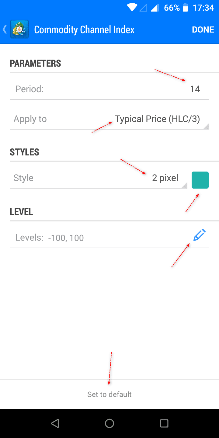 เมื่อท่าน tap ครั้งแรก ยังไม่มีอินดิเคเตอร์จะเป็บแบบนี้ เช่น ท่านเลือกใช้ CCI โปรแกรมก็จะแสดงค่า default มาก่อนเผื่อท่านจะปรับเปลี่ยนค่าและอื่นๆ เมื่อเสร็จท่านก็ tap คำว่า DONE ด้านบนเป็นการจบ