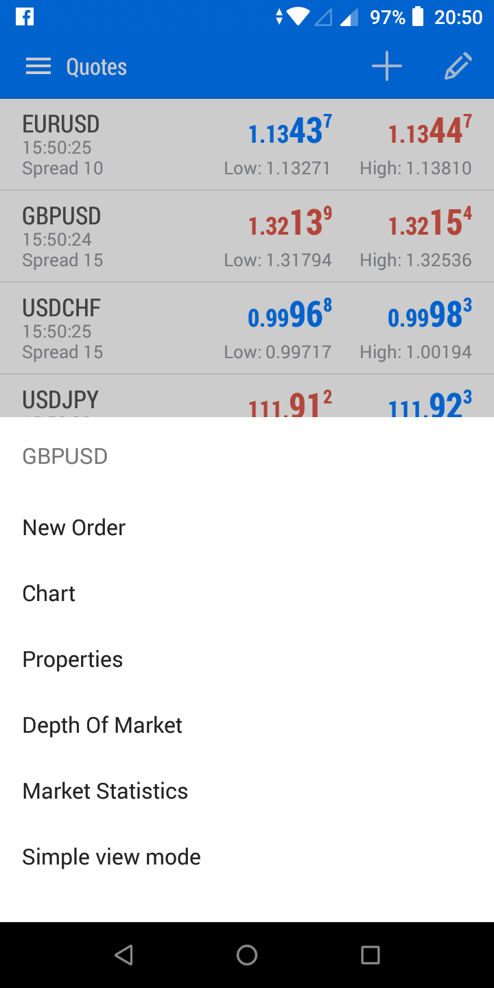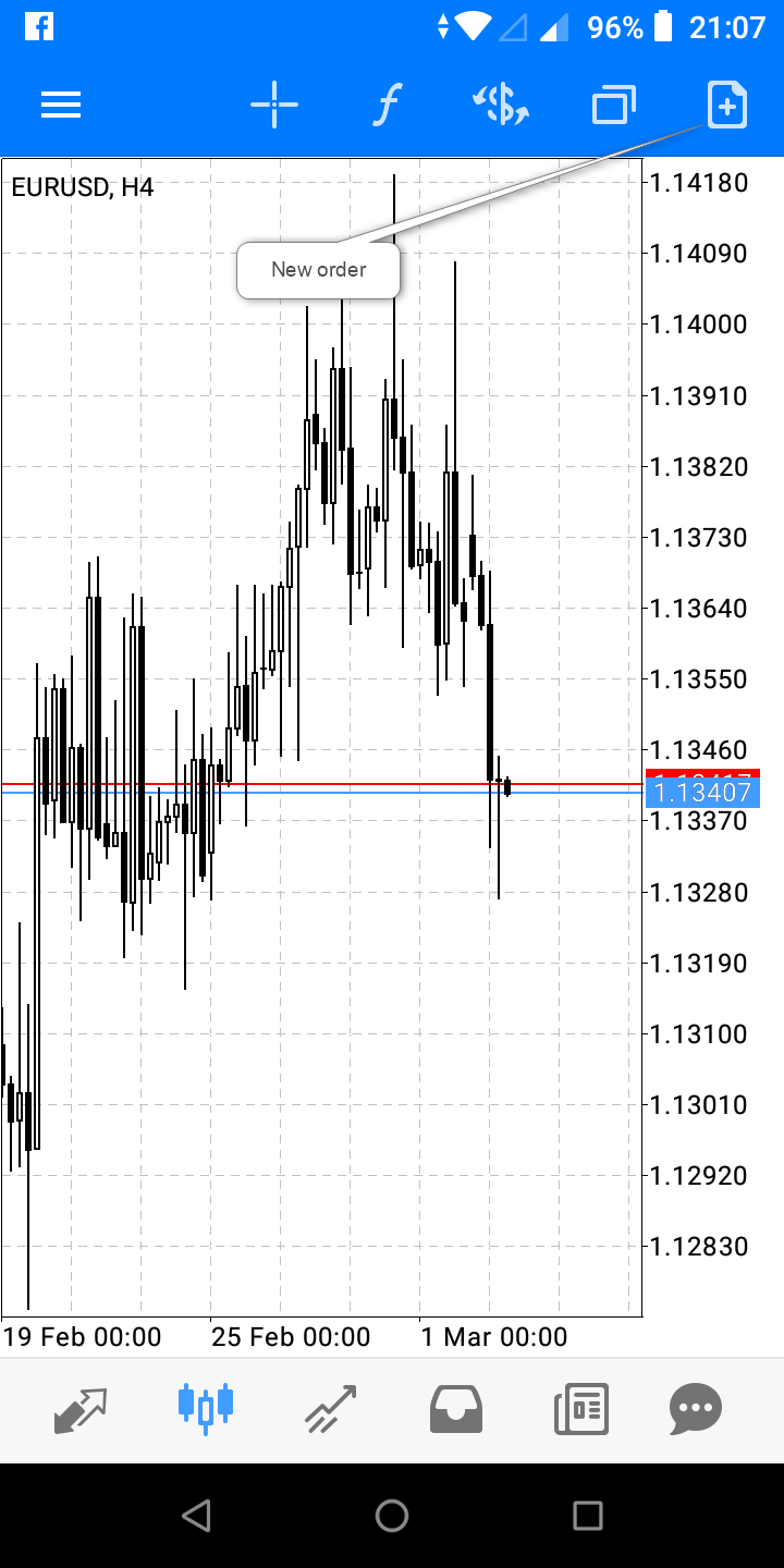 เรื่องการเทรด ท่านสามารถเปิดได้หลายทาง อย่างแรก ถ้าอยู่โหมด Quotes ท่าน tap คู่เงินที่ท่านต้องการเทรด โปรแกรมจะโชว์รายการขึ้นมา บนสุดจะเป็น New Order หรือถ้าอยู่โหมดชาร์ต ท่านก็สามารถ tap ด้านบนขวาสุดเพื่อเปิด New Order ได้ หรืออยู่โหมด Trade  ที่แสดงรายการการเทรดต่างๆ และยอมรวมบัญชีเทรด