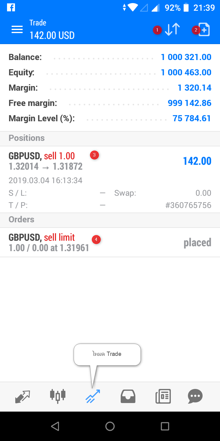 ในโหมดนี้ก็จะแสดงรายละเอียดทั้งหมดของ บช เทรด เลข 1 เป็นการเรียงอันดับ (Order, Time, Symbol และ Profit) และ เลข 2 เป็นสำหรับเปิด order ใหม่ และ เลข 3 รายการ positons ที่เปิดอยู่และ เลข 4 รายการออเดอร์ที่ pending เอาไว้หมด และเมื่อท่าน slide ที่ positions/orders มาทางด้านช้าย ก็จะมีรายการขึ้นมา