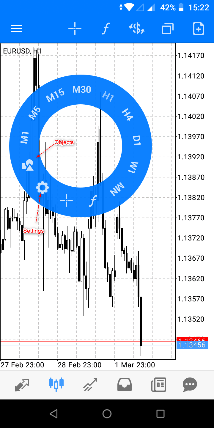 เมื่อท่าน tap ที่ชาร์ต จะมี Radial menu ขึ้นมาก็จะมี timeframes ให้เลือก ตามด้วย ไอคอน สำหรับเพิ่มและจัดการอินดิเคเตอร์ Settings สำหรับชาร์ตมี