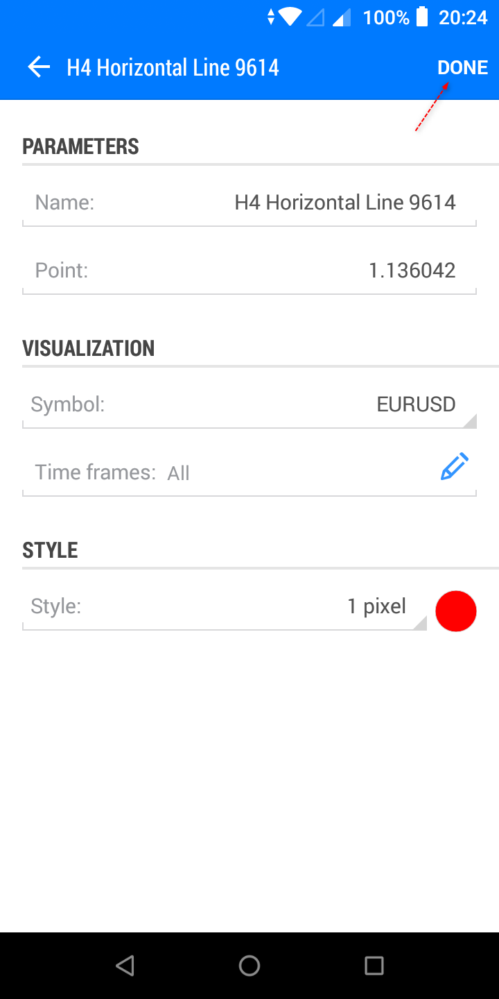 การปรับเปลี่ยนค่า objects จะมีค่าต่างๆ คือ Name, Ray right/left, Point, Symbol, Timeframe, Style และ Levels  ให้ท่านสามารถปรับได้ หลังจากเสร็จท่านก็ tap ที่ DONE ด้านบนขวา