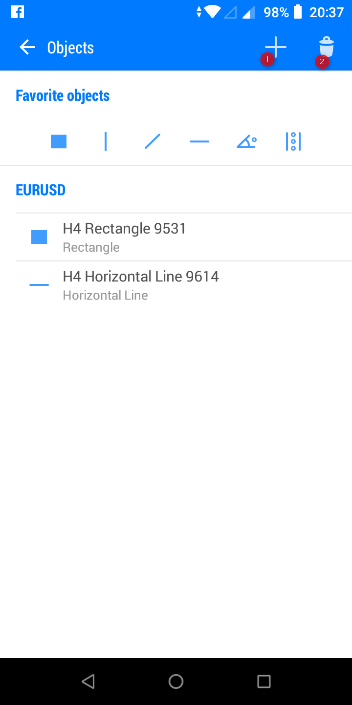 ก็จะมีรายการ objects ที่สร้างไว้ ท่านสามารถ tap ที่เลข 1 หรือไอคอน + เพื่อสร้าง object เพิ่ม หรือ tap ที่ไอคอนเลข 2 เพื่อเลือก objects ที่ต้องการลบ แล้วก็ tap อีกครั้งก็เป็นการลบ