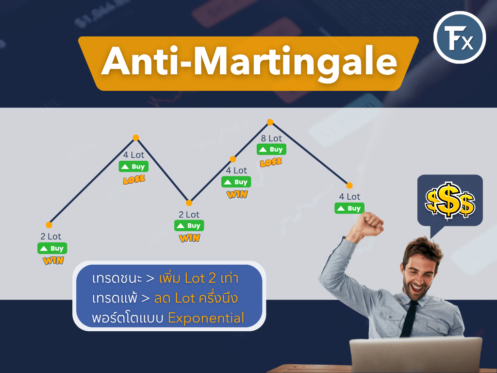 - Anti-Martingale มันก็คือตรงกันข้ามกับแบบ Martingale นั่นเอง แทนที่จะเบิ้ลล็อตกลยุทธ์นี้จะ “เพิ่มขนาดการลงทุนเมื่อมีกำไรสะสมและเงินทุนเพิ่มขึ้น” และอาจลดขนาดการลงทุนลงเมื่อขาดทุนแทน