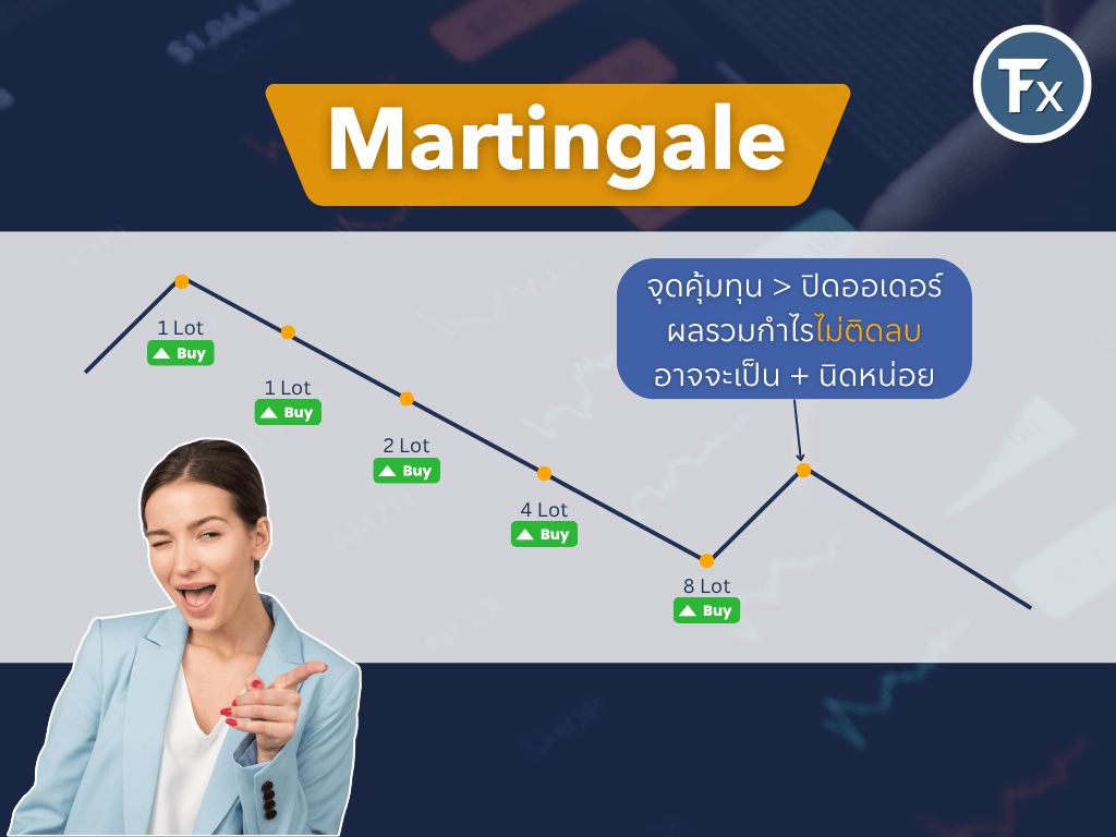 - Martingale หรือพูดแบบบ้านๆ ก็คือการเบิ้ลล็อต หลักการพื้นฐานของมันคือ “เมื่อเทรดเสียหรือขาดทุนในครั้งต่อไปให้เพิ่มขนาดการลงทุนเป็นสองเท่า (หรือมากกว่า)” เพื่อให้กำไรครั้งเดียวสามารถครอบคลุมผลขาดทุนที่ผ่านมาทั้งหมด