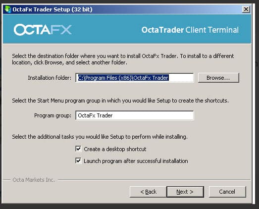 ภาพแสดงการติดตั้ง MT4 ของ OctaFx ที่ลงบนเครื่องคอม ติดตั้งไม่ยากเลย แค่ Click => Next , Next , Next และ OK แค่นี้เอง จากนั้นก็ สามารถเข้าใช้งานโปรแกรมได้เลย