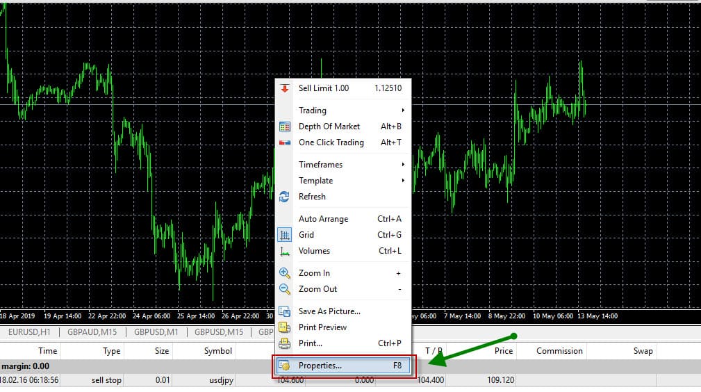 - เลือก Properties โดย เมนูนี้จะเป็นการปรับแต่งหน้าจอให้ตรงกับความต้องการในการใช้งานโปรแกรม MT4 ของเราเอง รายละเอียของเมนู ตามภาพด้านล่างเลย
