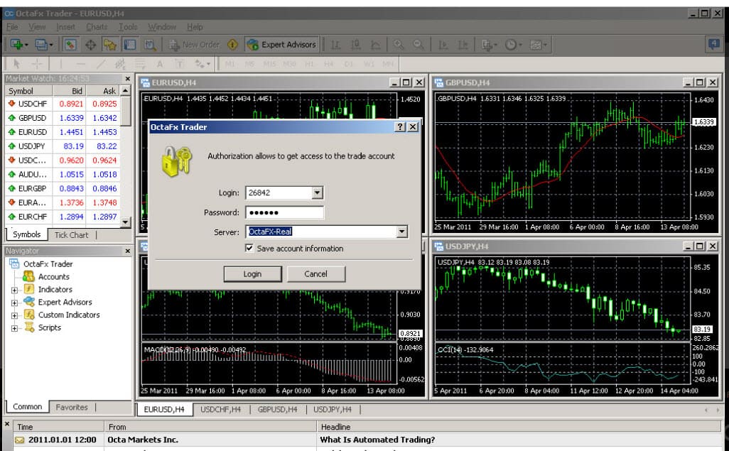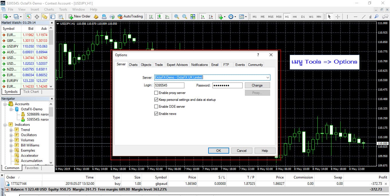 หน้าจอการ Login เข้าใช้งานโปรแกรม MT4 เด๋วเรามาดูถึงการใช้เมนูของ MT4 กันเลย พอร์ตที่ผมนำมา รีวิวนั้นเป็นพอร์ต เดโมของ OctaFx ซึ่งสมัครแข่งขันกับโบรกครับ
