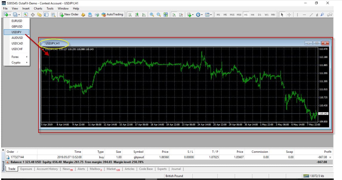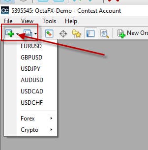 จากนั้นเราสามารถเลือกคู่เงินที่ต้องการ เมนูแรก จะแสดงเฉพาะคู่เงินหลัก ๆ และยังมีเมนูย่อยตามมาอีกครับ อ้อ OctaFx ให้เทรด Crypto ได้ด้วยนะครับ แต่ยังไม่พูด มาดูวิธีที่สองกันวิธีนี้ เลือกจาก ปุ่ม เครื่องหมาย บวกสีเขียว แล้วเลือกคู่เงินจากเมนูนี้ได้เลย โดยเมนูนี้จะแสดงคู่เงินหลัก เช่น EUR/USD , GBP/USD,USD/JPY , AUD/USD , USD/CAD ในตอนนี้ผมขอเลือกคู่เงิน USD/JPY เป็นคู่แรกครับ