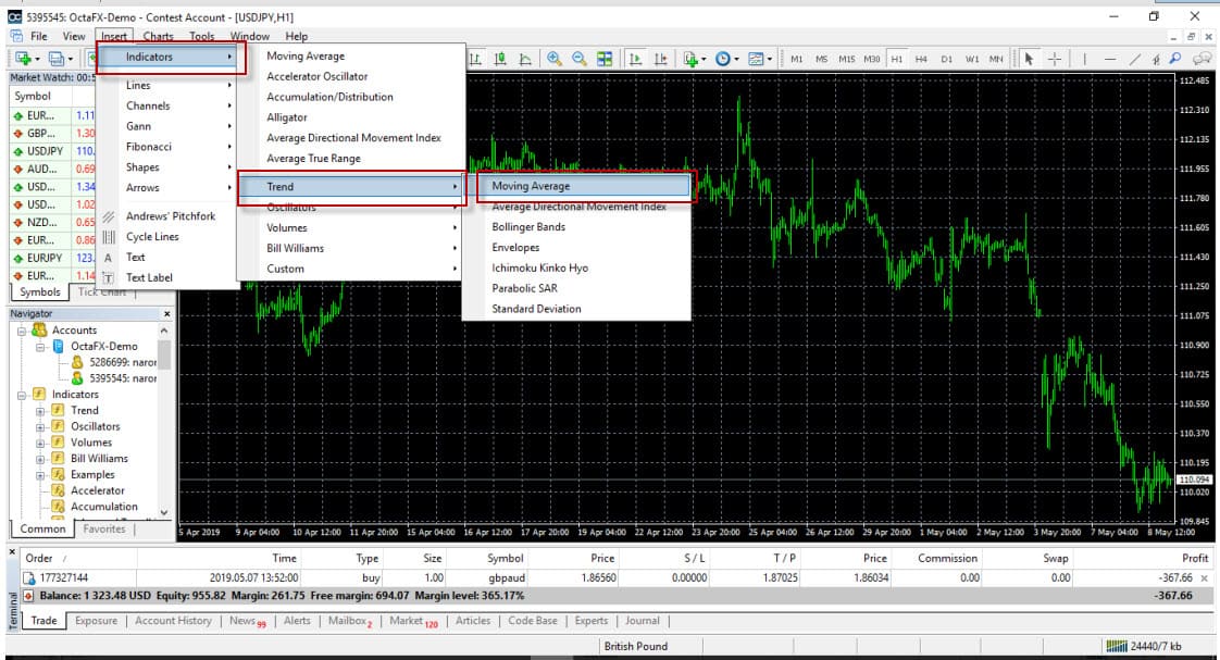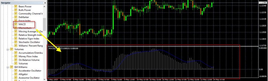 - เอามาจาก ตรง Navigators เราใช้เม้าท์ ชี้ไปที่ อินดี้ MACD ตามภาพด้านล่าง แล้ว click mouse ค้างไว้ ลากมาใส่กราฟได้เลย